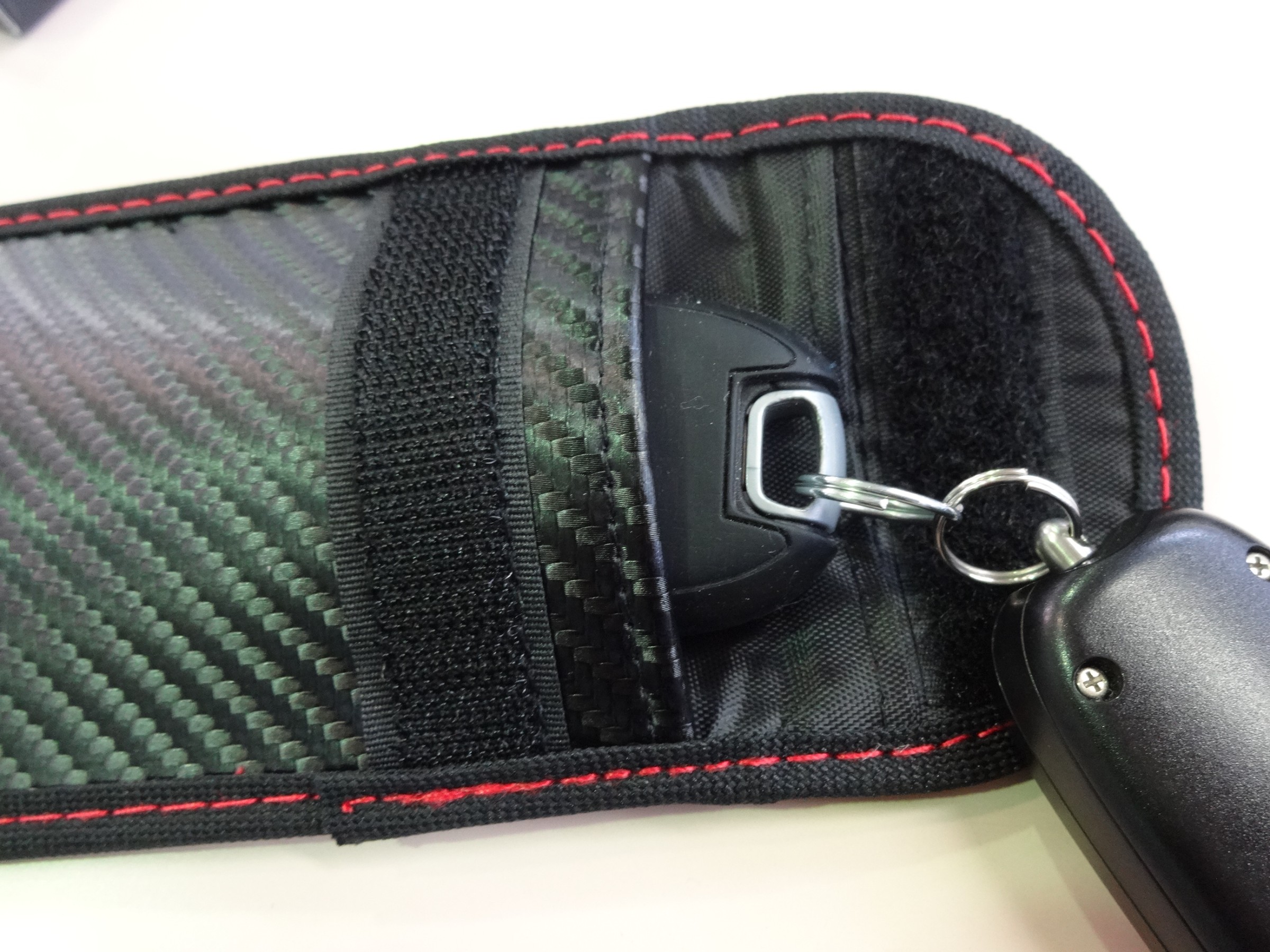 ポーチ自体が二重構造になっており、奥側は電波が遮断されリレーアタックからガード。