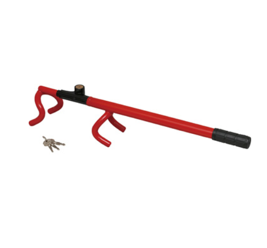 こちらは物理的に車を動かせなくするハンドルロックです。フックが2つのものがいいですね。スポークにかけると強力でハンドルを切っても外れません。