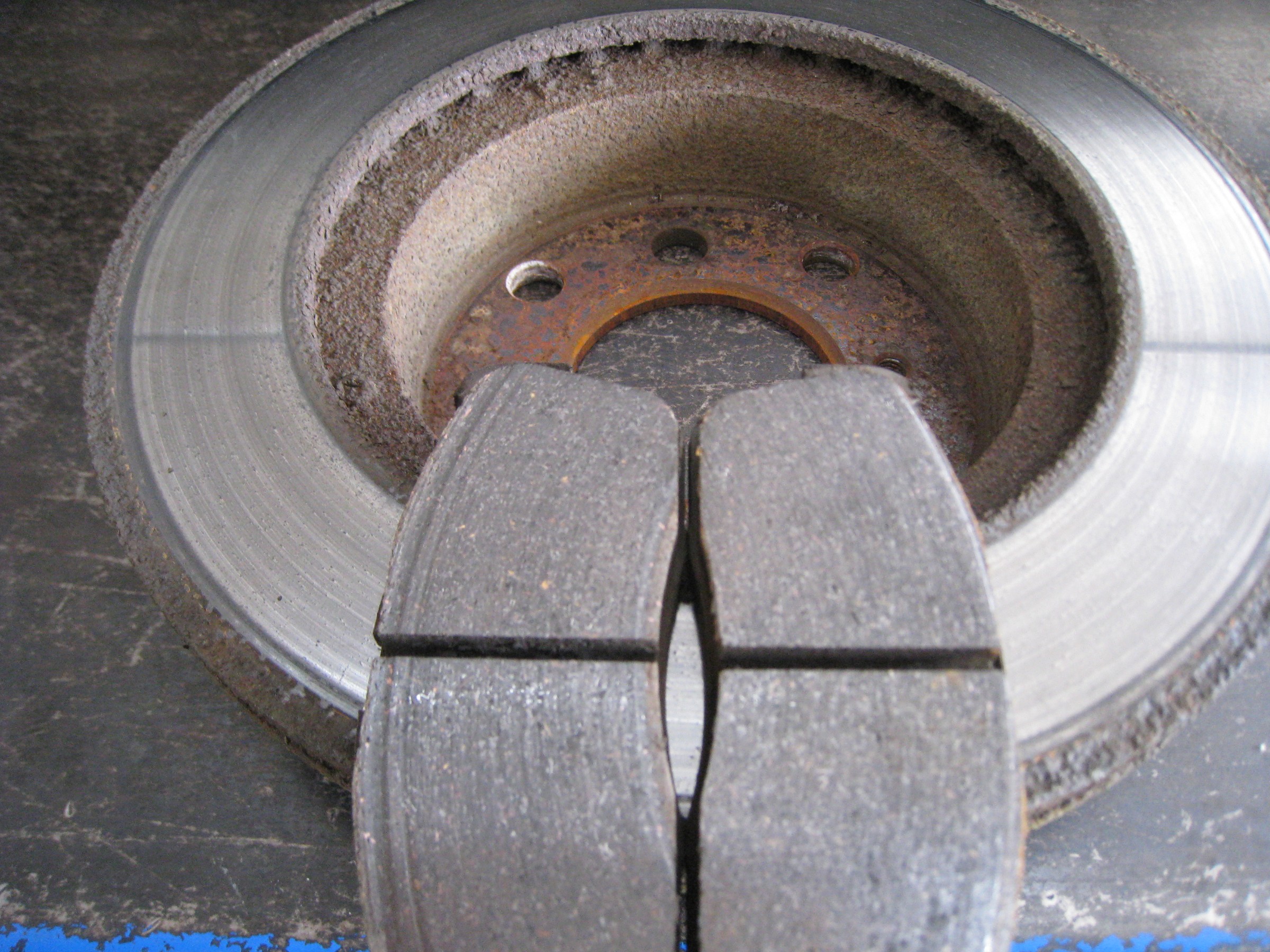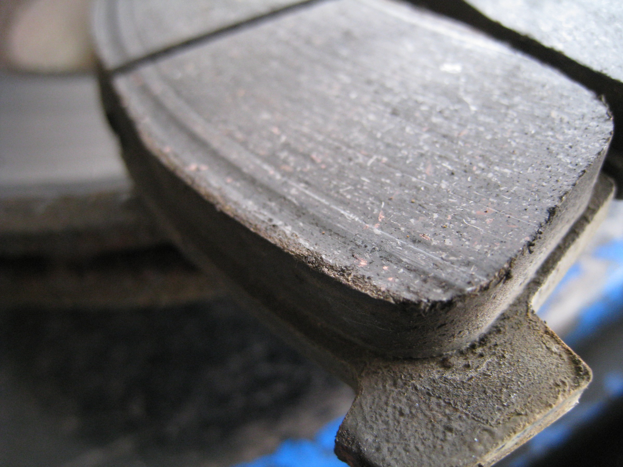 取り外したパッドには、ディスクローターの錆の影響で段付き磨耗があります。