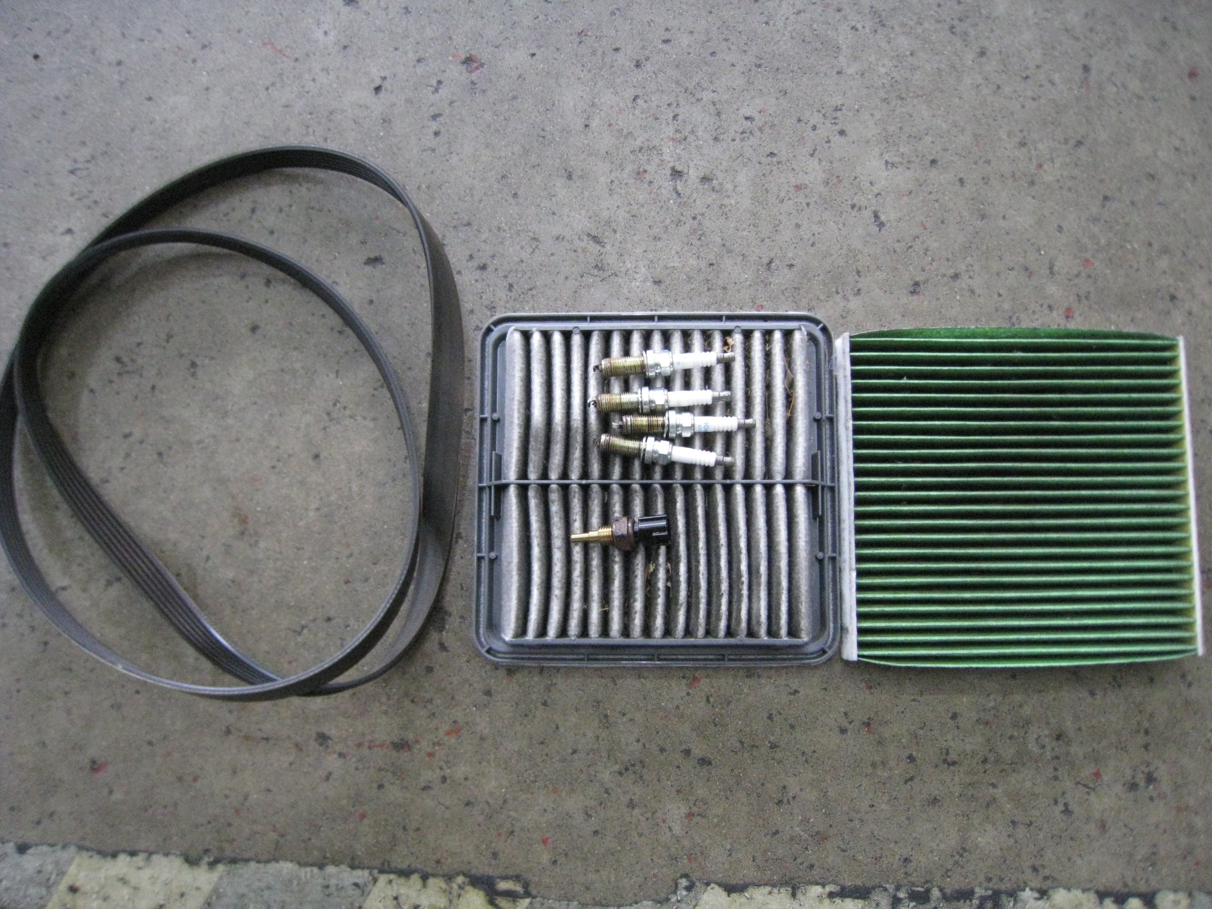 ファンベルト、エアクリーナー、スパークプラグ、油温センサー、A/Cフィルターです。