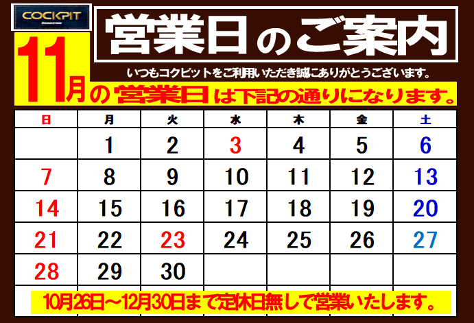 2021年10月26日 ツイート いつもコクピット西部をご利用いただき ありがとうございます。 タイトルの通りお知らせいたします。 明日10月27日(水)から 12月30日まで定休日なく営業いたします。 タイヤ交換の為、大変混雑いたしますので ご来店の際にはお時間に余裕を持ってご来店くださいませ。 Prev Next