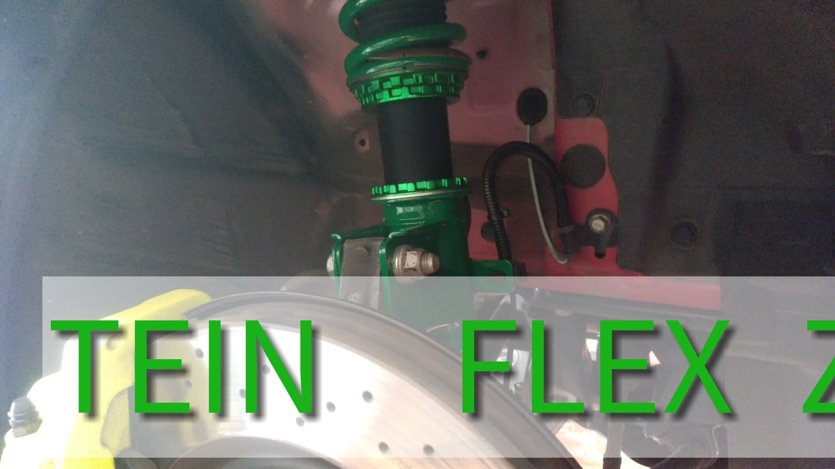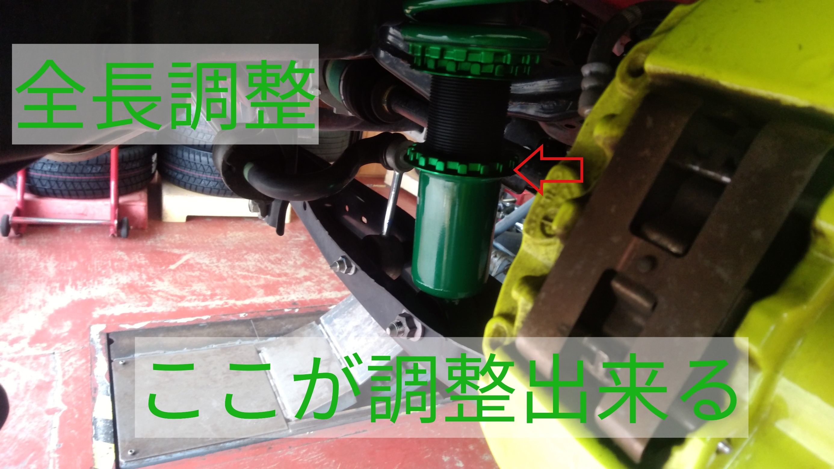 赤いボディに黄色いキャリパー、緑の車高調で格好いいですね!