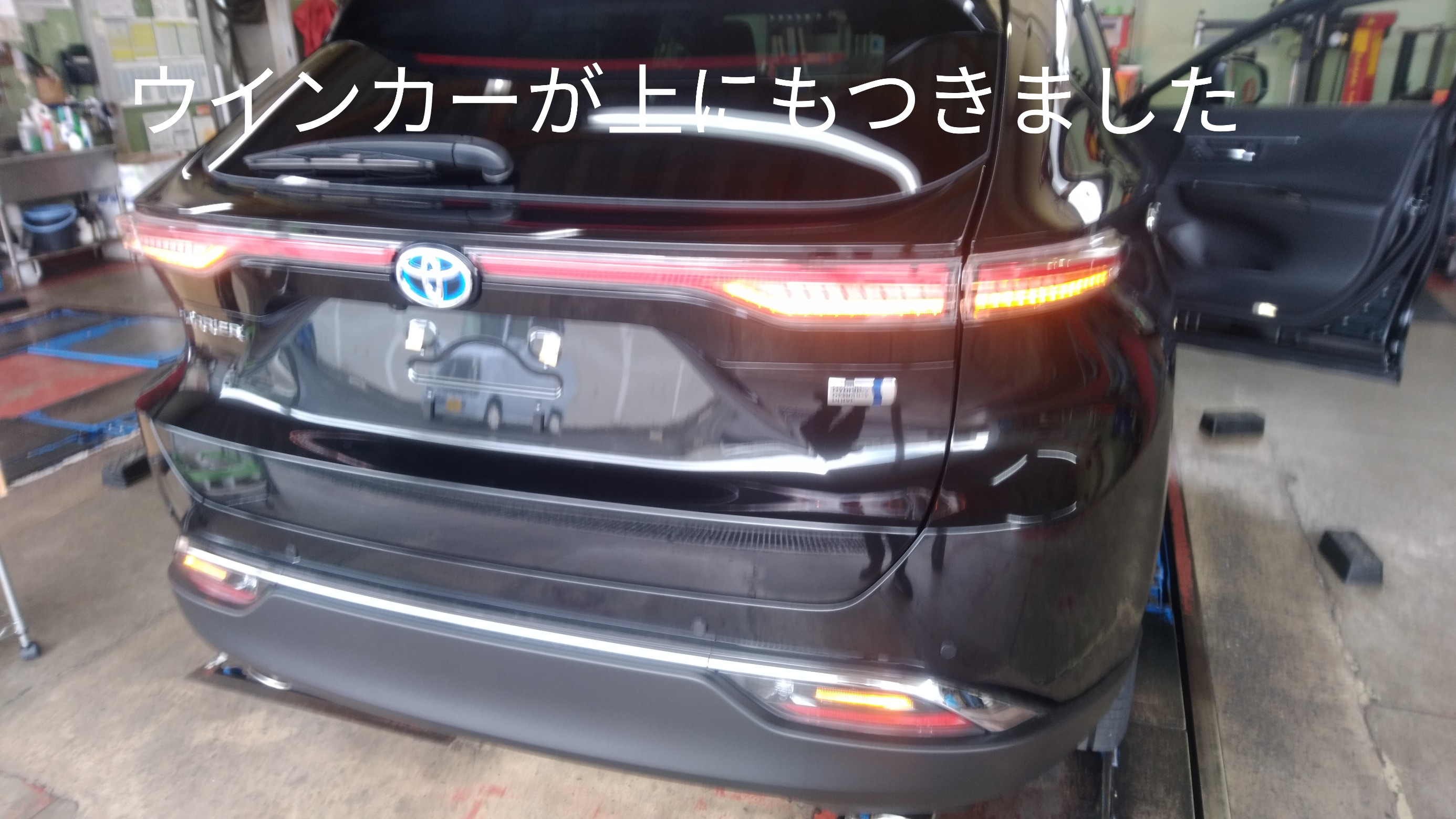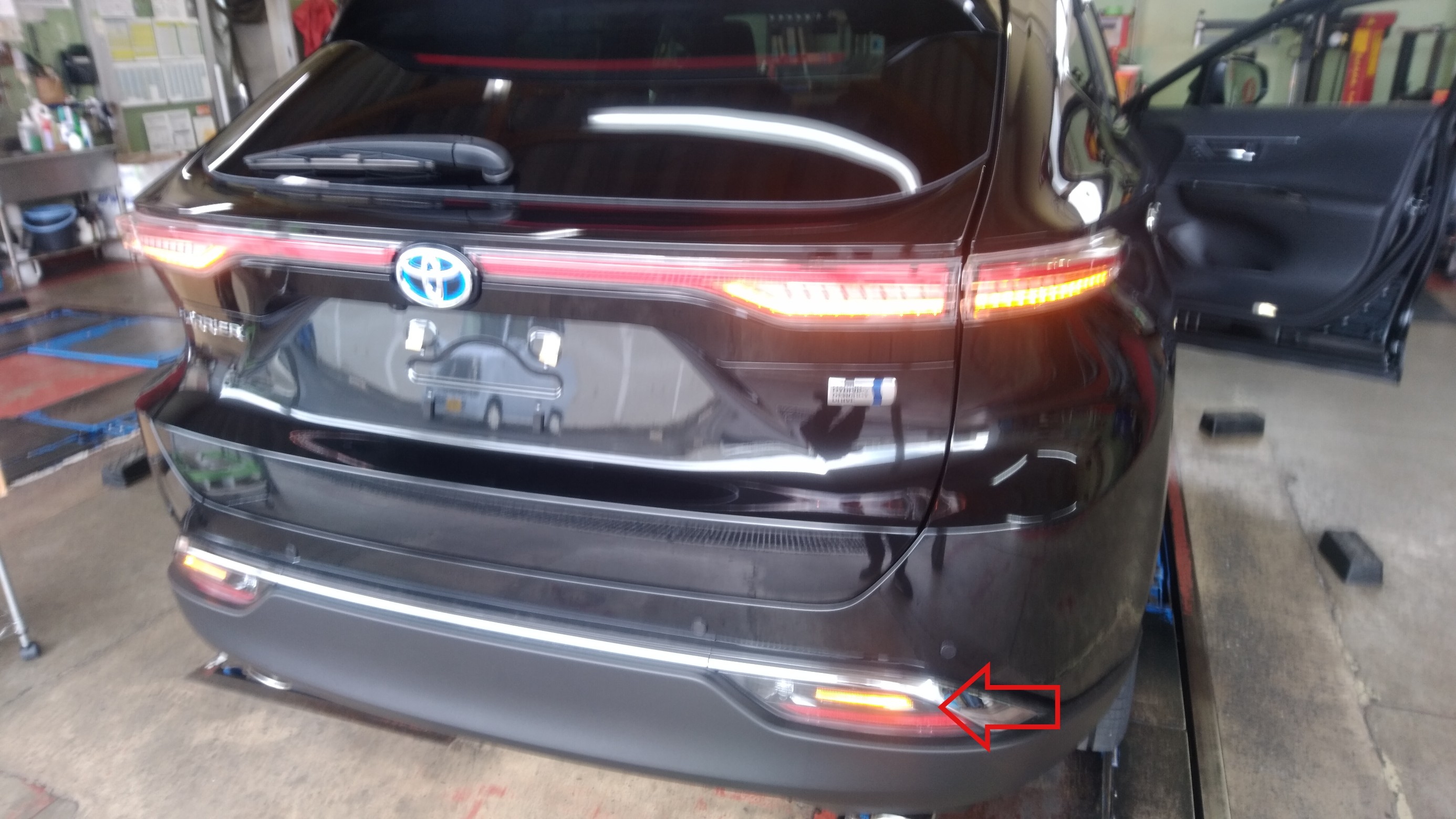 最近の新型車両は輸入車から始まりテールが左右につながったデザインが多いですね。こちらのハリアーはスモールを点灯させると光が流れます。格好いいですが、今回は元に戻します。