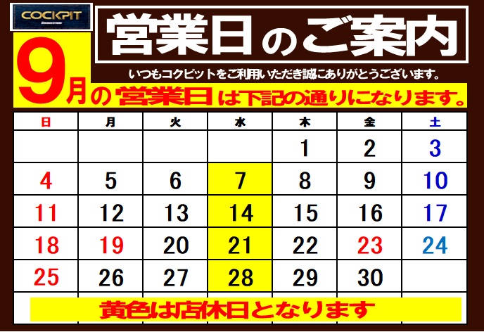 2022年9月1日 ツイート いつもコクピット西部をご利用いただきありがとうございます。 9月の定休日についてご案内いたします。 9月は毎週水曜日のみ定休日となります。 9月度もコクピット西部をよろしくお願いいたします! Prev Next