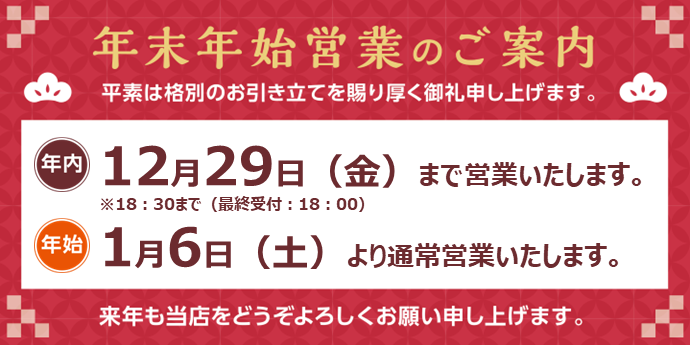 年内は12/29(土)まで通常営業しておりますので宜しくお願い致します。