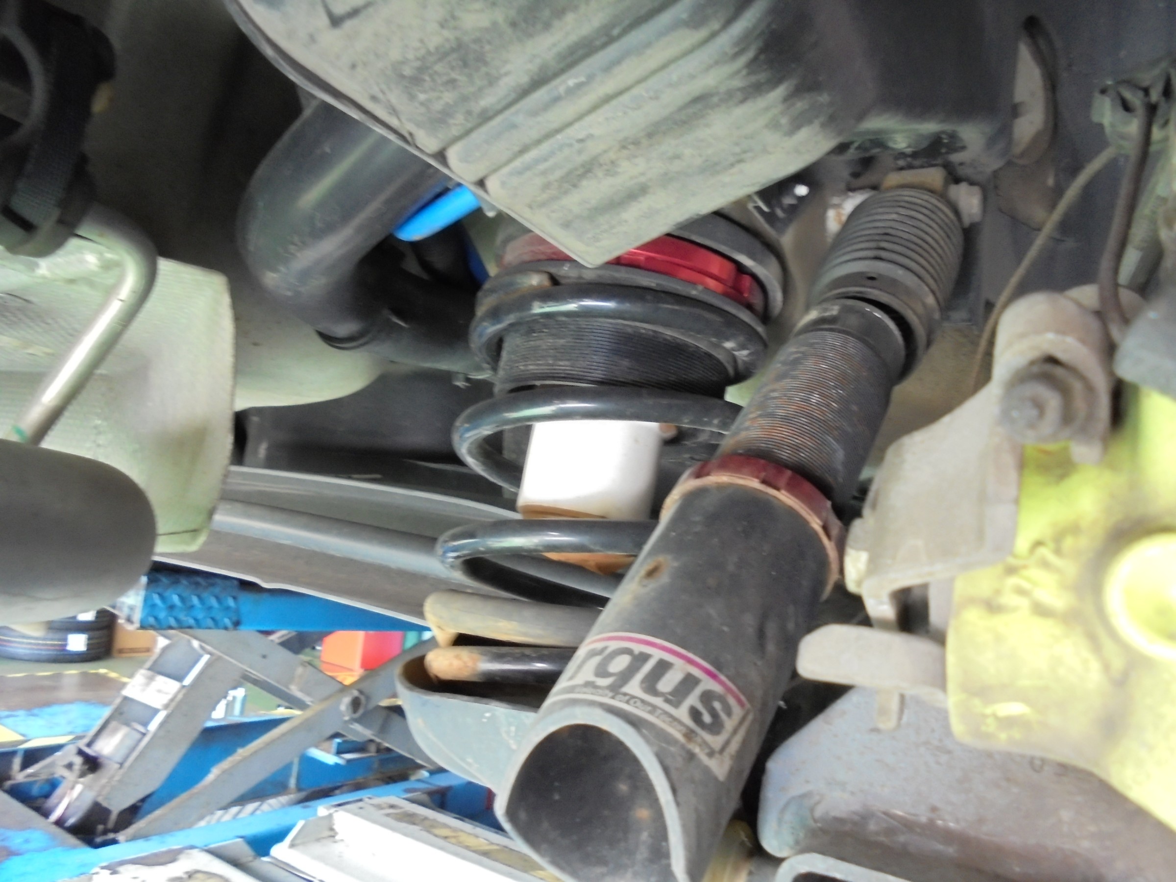 異音もあるとの事で、下から覗いてみたところ、かなりやれている状態の車高調が確認されました( ;∀;)
