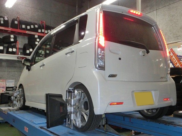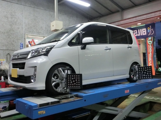 さらにそのあとは、先日車高調とタイヤホイールをご購入いただいたLA110系ムーヴカスタムのアライメント。