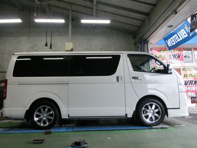 ハイエースはフロントのキャスター、キャンバー、トー、すべていじれますので、ある程度の範囲なら純正と変わらない快適さとタイヤの減りを実現できます。