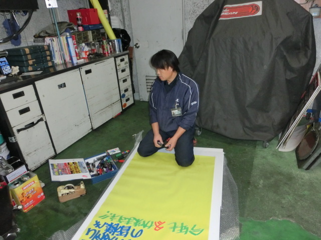 そんな寒いPITの中で、石川さんは何時もお世話になっているP社様へ掲示するポスター作りをしていました。寒い中の作成、お疲れ様です。