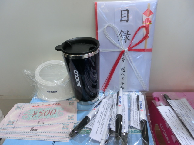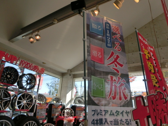 指定銘柄のタイヤ4本(ブリザック、ポテンザ、レグノ、エコピア、デューラー)をお買い上げのお客様に、その場で抽選で賞品をプレゼントしております。