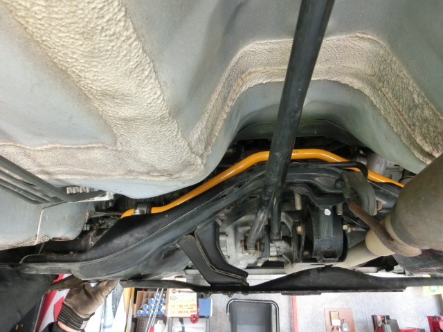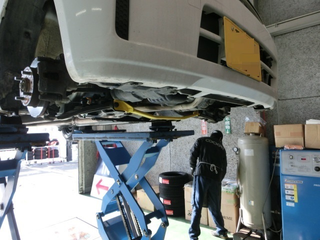 さて、本日の作業はミラにスタビライザー装着からスタートです。こちらのお車、バン登録なのでスタビが前後とも付いていません。