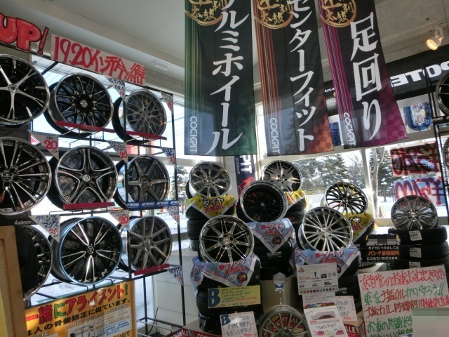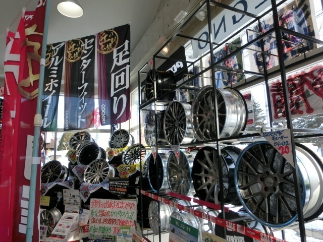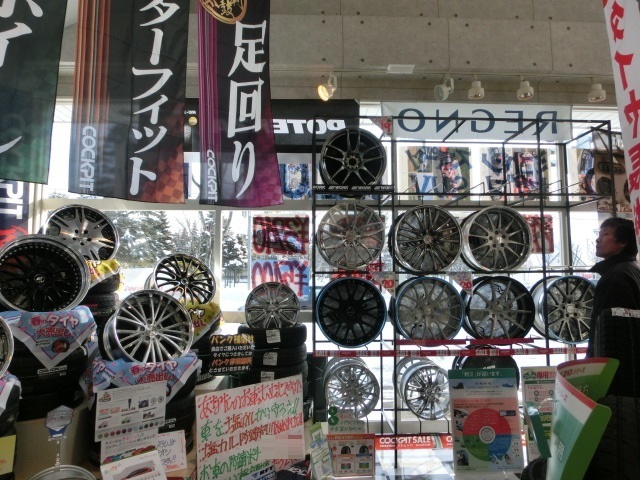 一昨年のリニューアル後にホイールラックを少なくしたのですが、ホイールのボリュームが無くなったので今年はラックを追加して、ホイールを多く展示できるように変更しました。