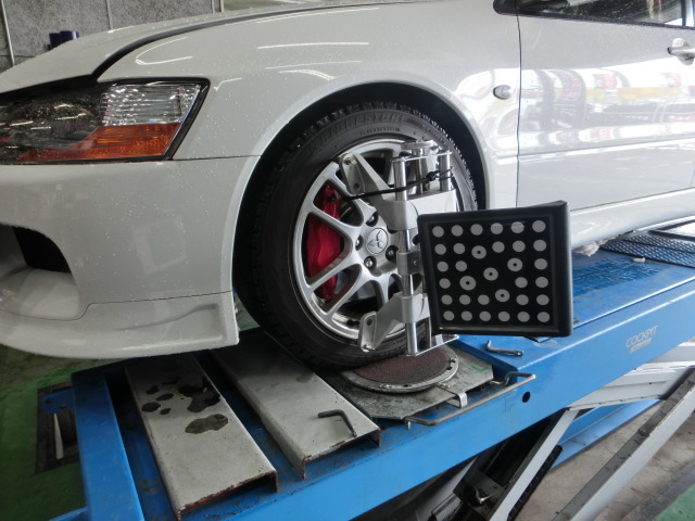 最後はランサーEVO9に、当店自慢のアライメント調整とHKSスーパーフィルターの交換です。