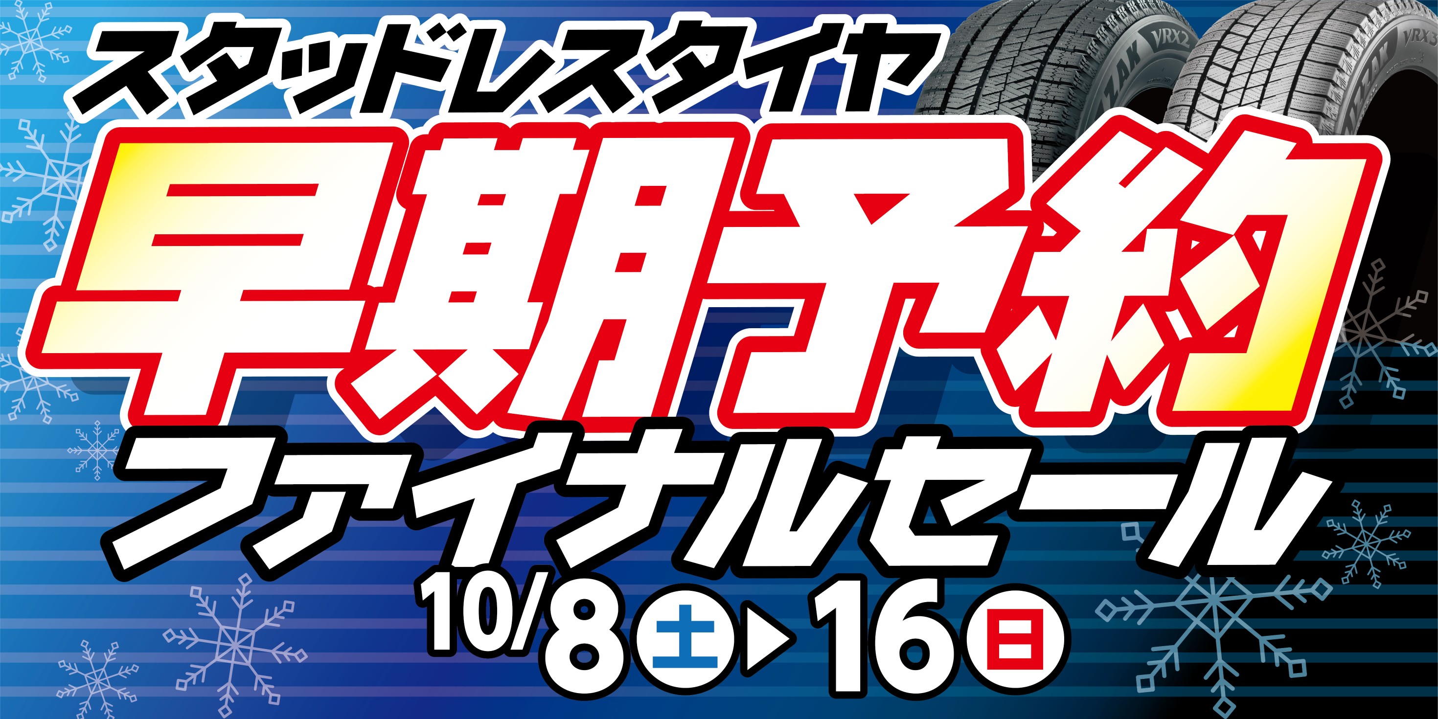 2022年10月8日 ツイート 本日よりスタッドレスタイヤ早期予約ファイナルセール開催! 10月8日(土)~10月16日(日)迄 今季最後の期間限定ファイナルセールです。 スタッドレスタイヤのみではなく夏タイヤも売り切り価格でお買い得です。 このお得な9日間、お問い合わせをお待ちしています。 Prev Next