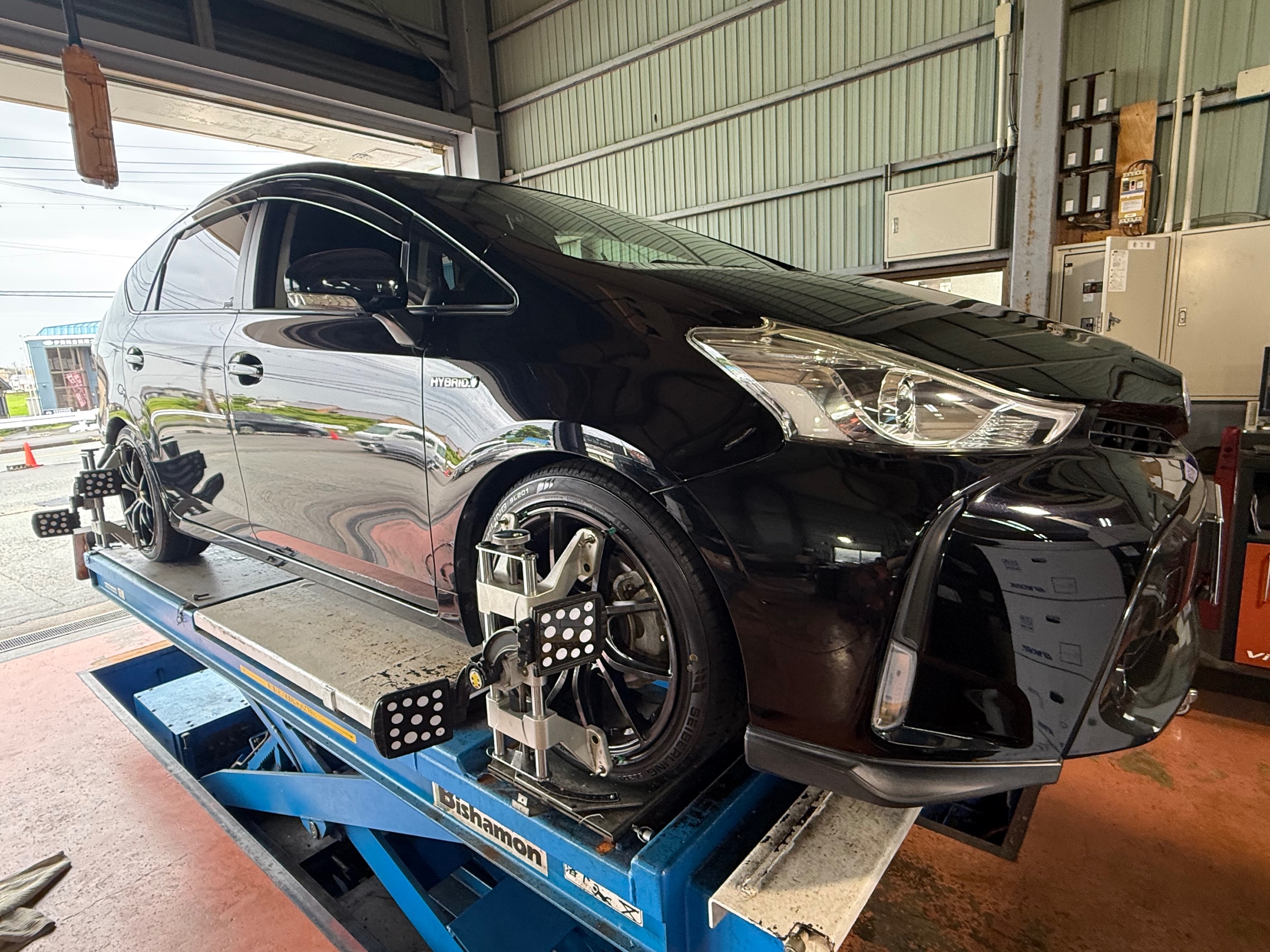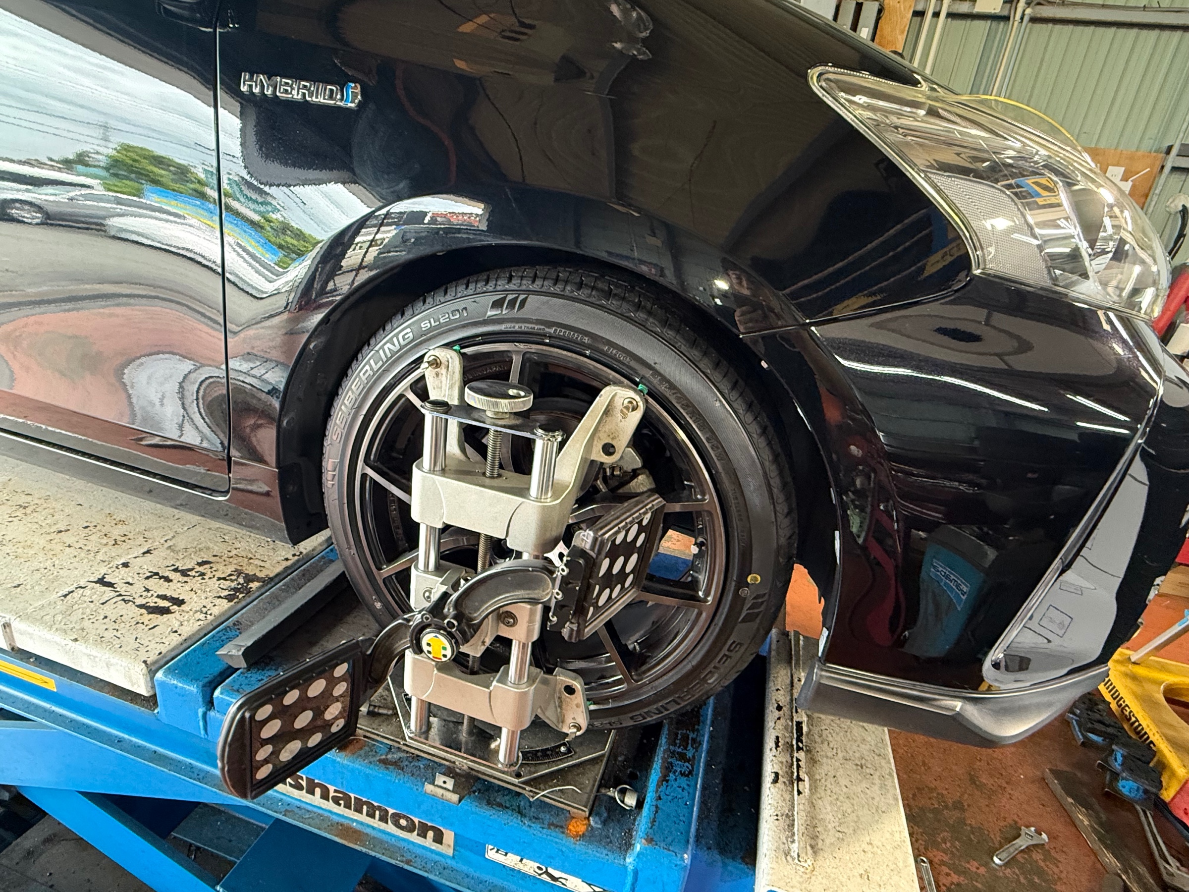 プリウスアルファのタイヤをブリヂストンのセイバーリングに交換。内減りしていたので、アライメント調整もさせて頂きました。