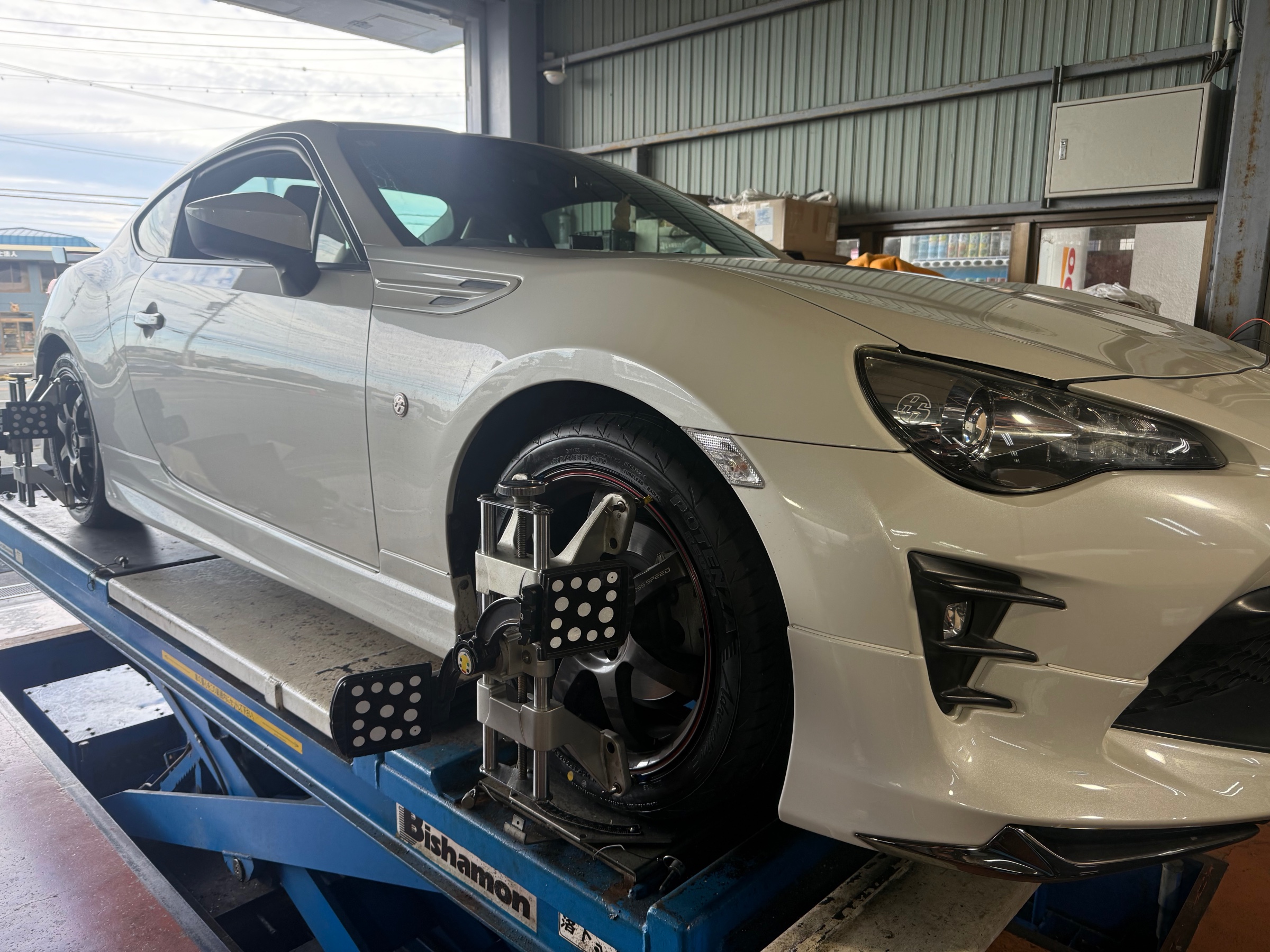 トヨタ86のタイヤをブリヂストンのポテンザ アドレナリンRE004に交換し、アライメント調整をしました。