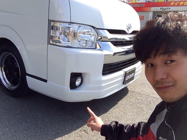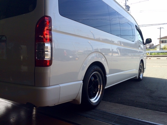 本日は、トヨタ ハイエース グランドキャビンへのタイヤ、ホイール、Fリップスポイラーの取り付けをアップさせて頂きます!