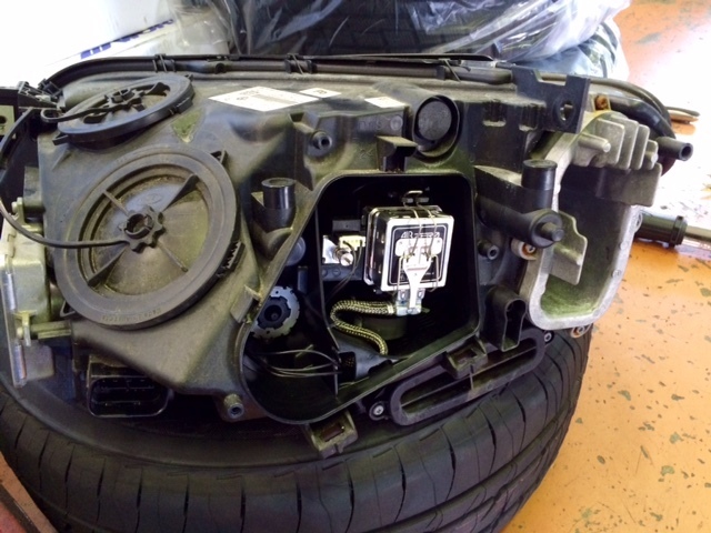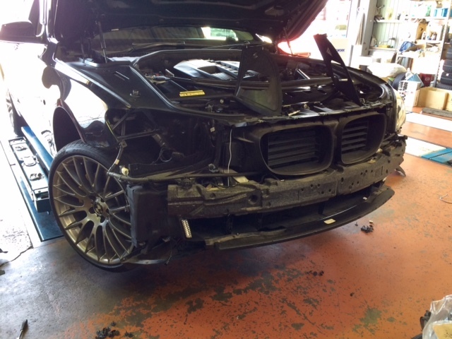 BMW F01は、写真のようにバンパーを外し、ヘッドライトも外さないと交換できませんので、フォグとの同時交換もオススメです!