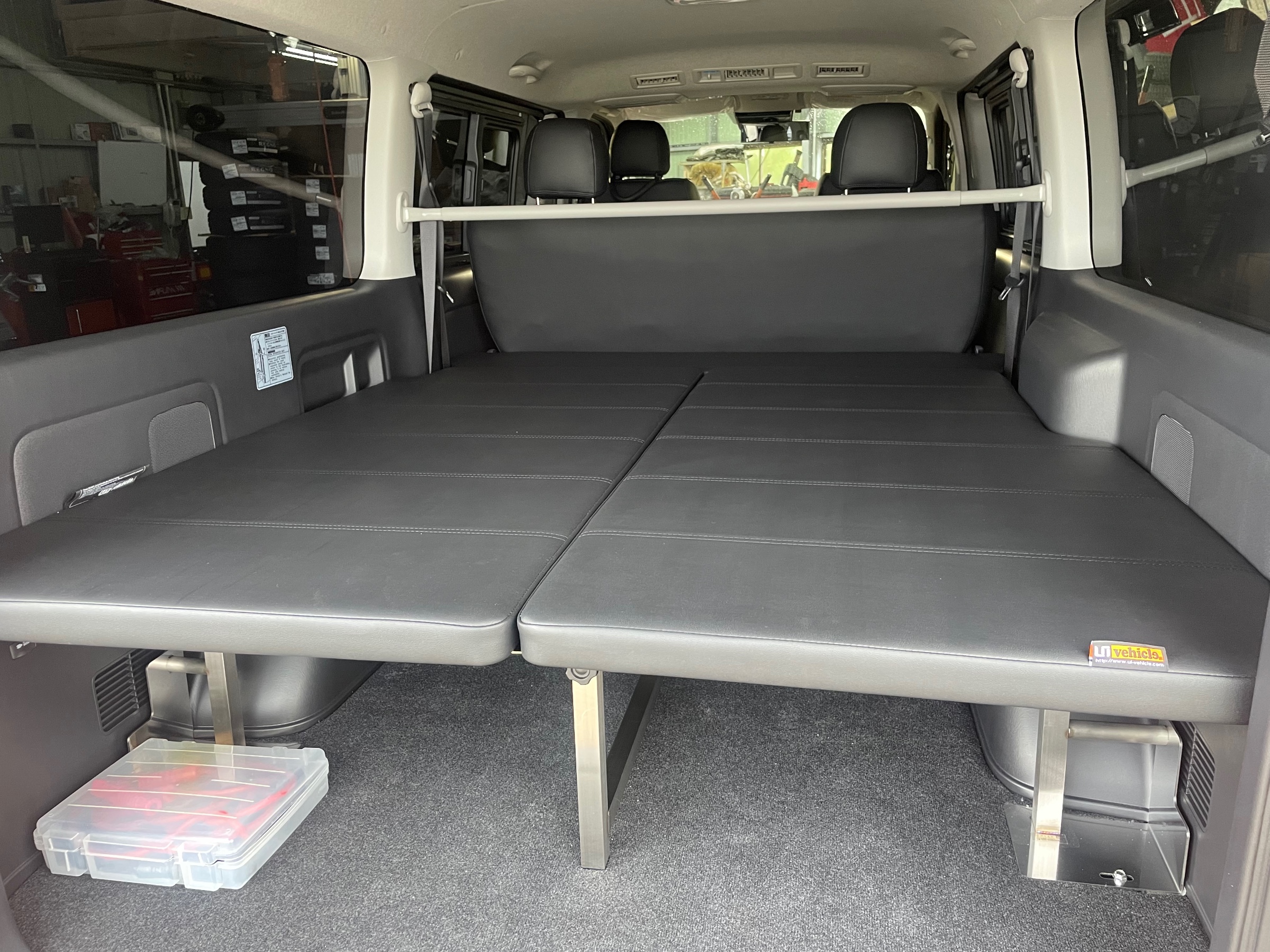 本日はハイエース スーパーGLにユーアイビークルのシートカバーとマルチウェイベッドキットを取付させて頂きました。