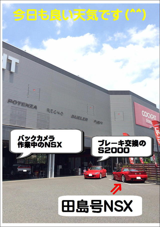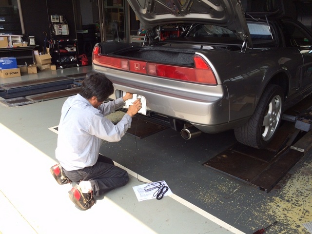 隣はNSXのバックカメラ装着、作業は現NSXオーナーの田島チーフ。