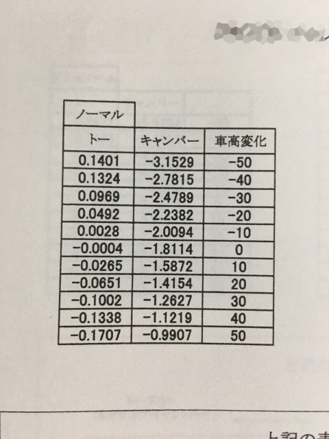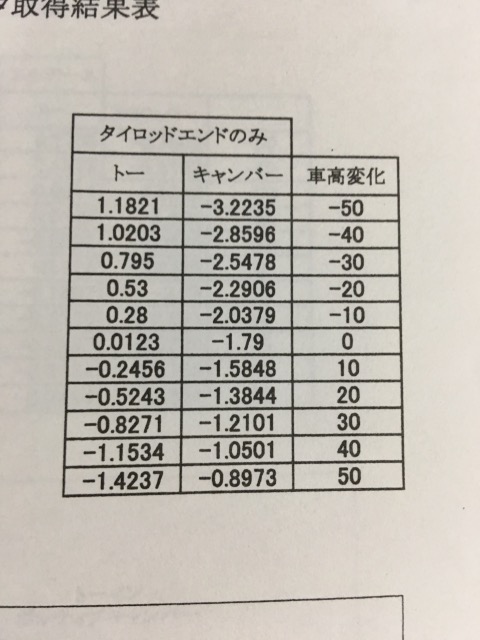 トー変化、キャンバー変化量の数値です。