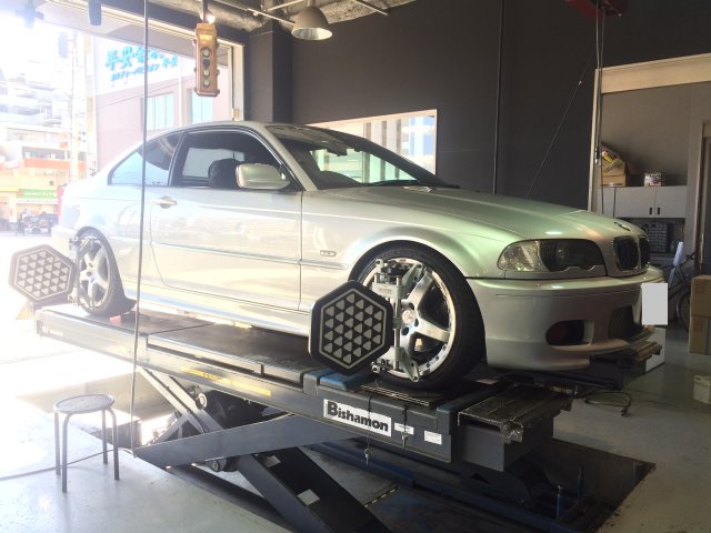 このE46は他店で車高調を組まれたようですが、アライメント未実施のためご来店。