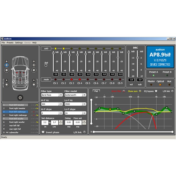 Primaシリーズは、スピーカー出力しかない純正デッキやカーナビゲーションから2chの信号を入力するだけで、9chのクロスオーバー、タイムアライメント、10バンドパラメトリックイコラーザーの設定が可能です。アンプを内蔵しておりますのでそのままスピーカーラインに戻し、純正のボリュームやトラック切替、ソース切り替えなどの機能を損なわず、オーディオシステムを劇的に変化させることが可能です。