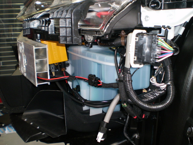 次にパワーユニットの固定ですが、なかなか良い場所が見つからず模策した結果、「ウォッシャータンク横」に決定。(写真参照、黄色いBOXがパワーユニット)