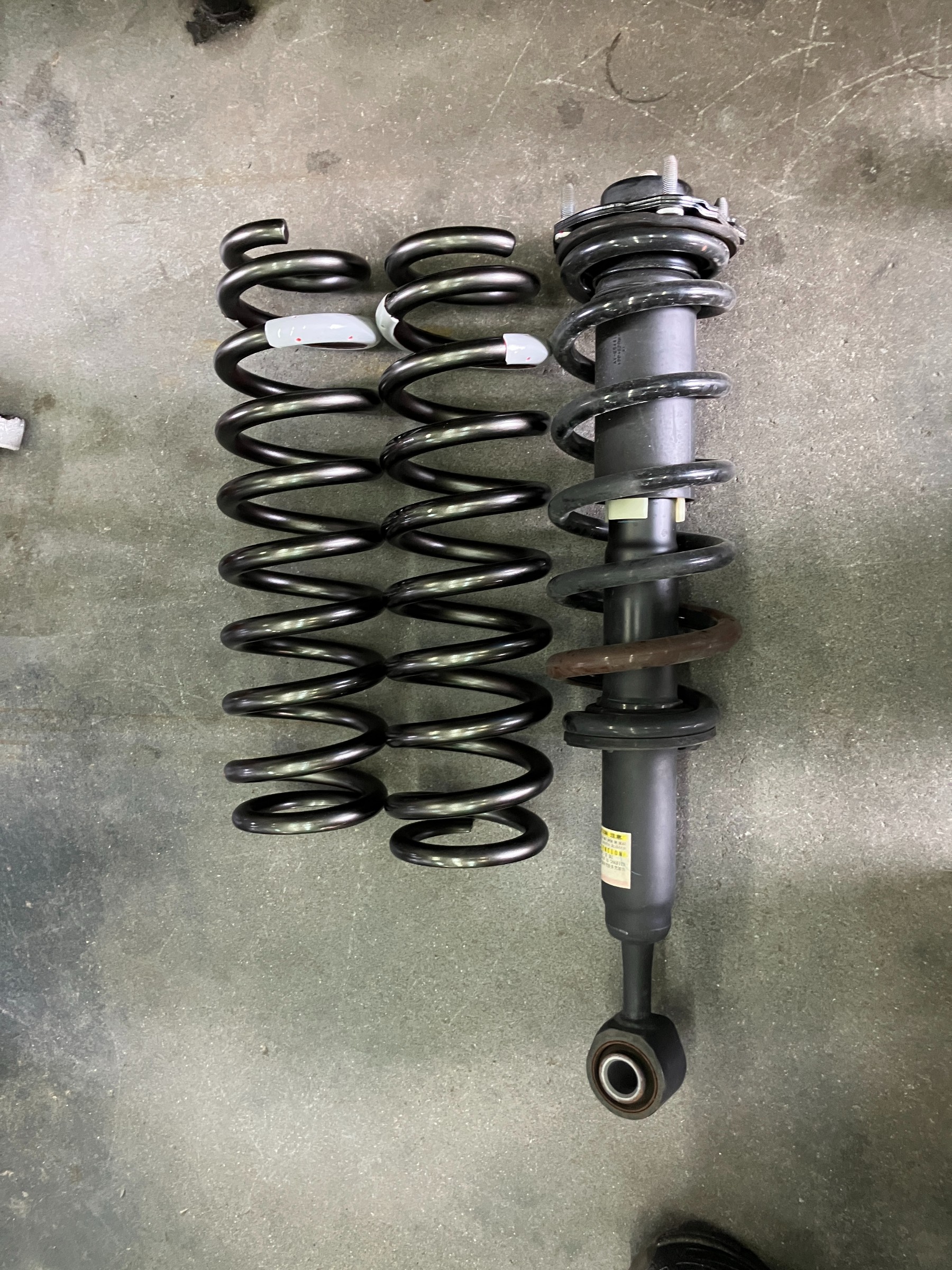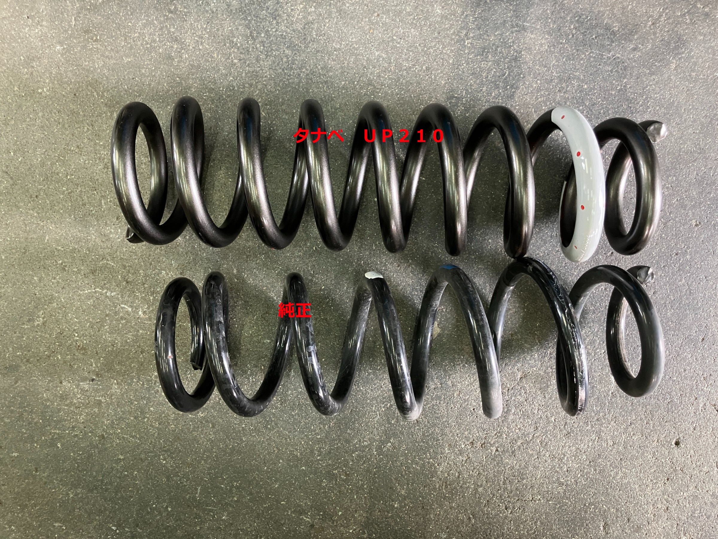 純正バネと比較すると、重たい車両をアゲなければならないので太くて巻数が多くて長いですね。