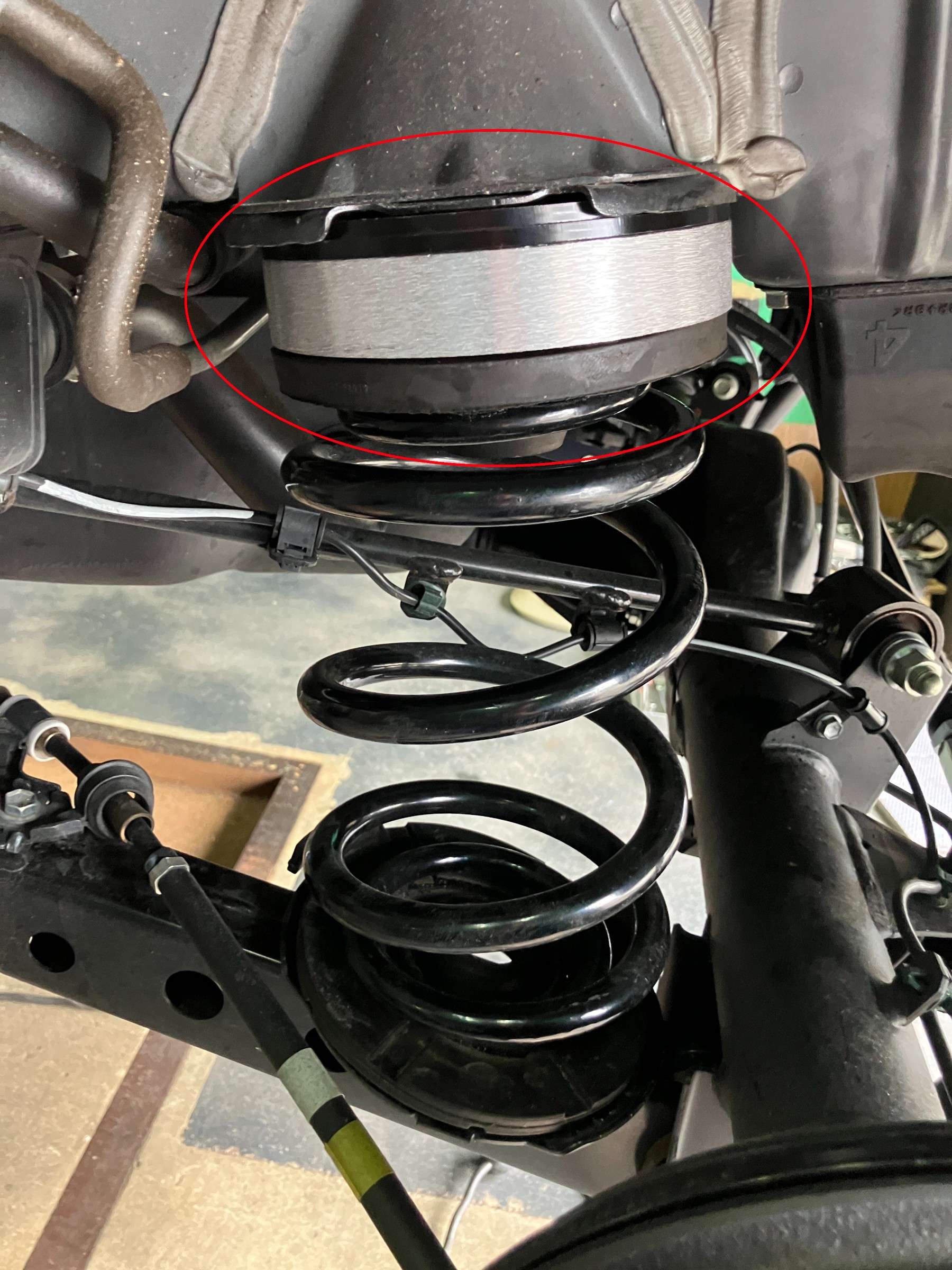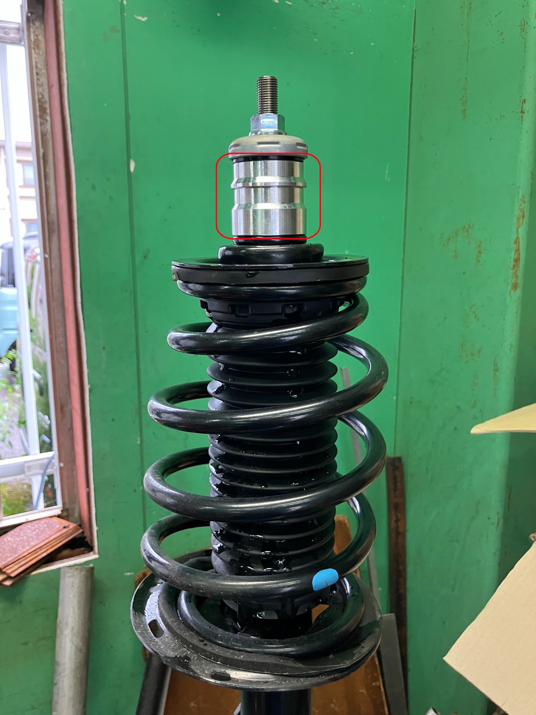 赤枠で囲んだ部分のスペーサーをアッパーマウントベアリングのしたに組み込みます。