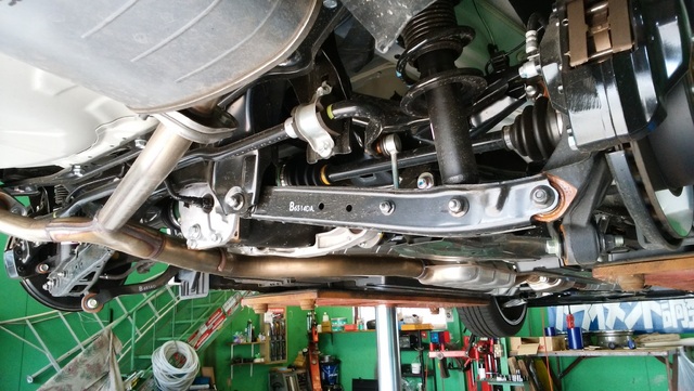 取り付けしました。(この後リフトから降ろすと前下がり過ぎたので、ここからもう少しリヤを下げました)
