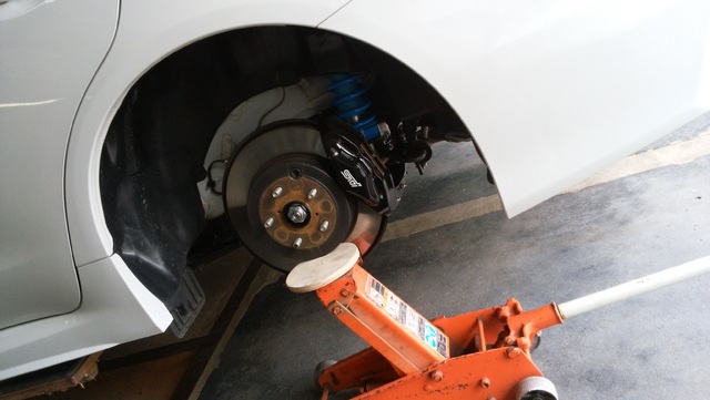 ボルトを締める際に、なるべく本来の1Gに近い状態にするため、タイヤに近い部分にジャッキを当ててあげます(フロントも同様です)。