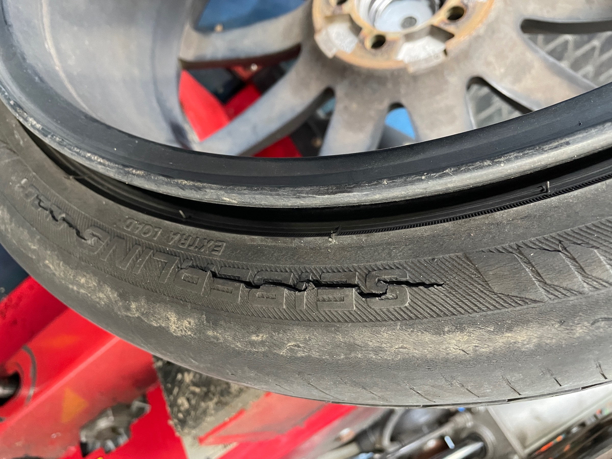これまでご使用のタイヤは空気圧不足と経年劣化で内側と外側が摩耗し、イン側のサイドウォールにクラックが入っていました(汗)