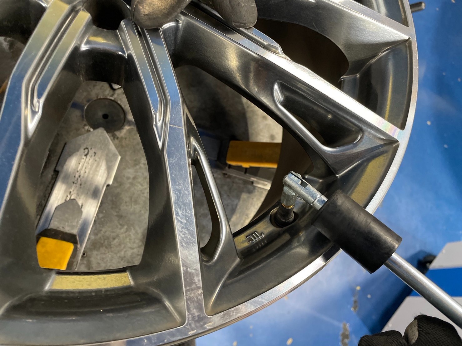 後は専用のバランサーでタイヤをくるくる回しバランス測定を行い、指定の場所にバランスウェイトを貼り付け、再度測定し数値を確認すれば交換完了です。