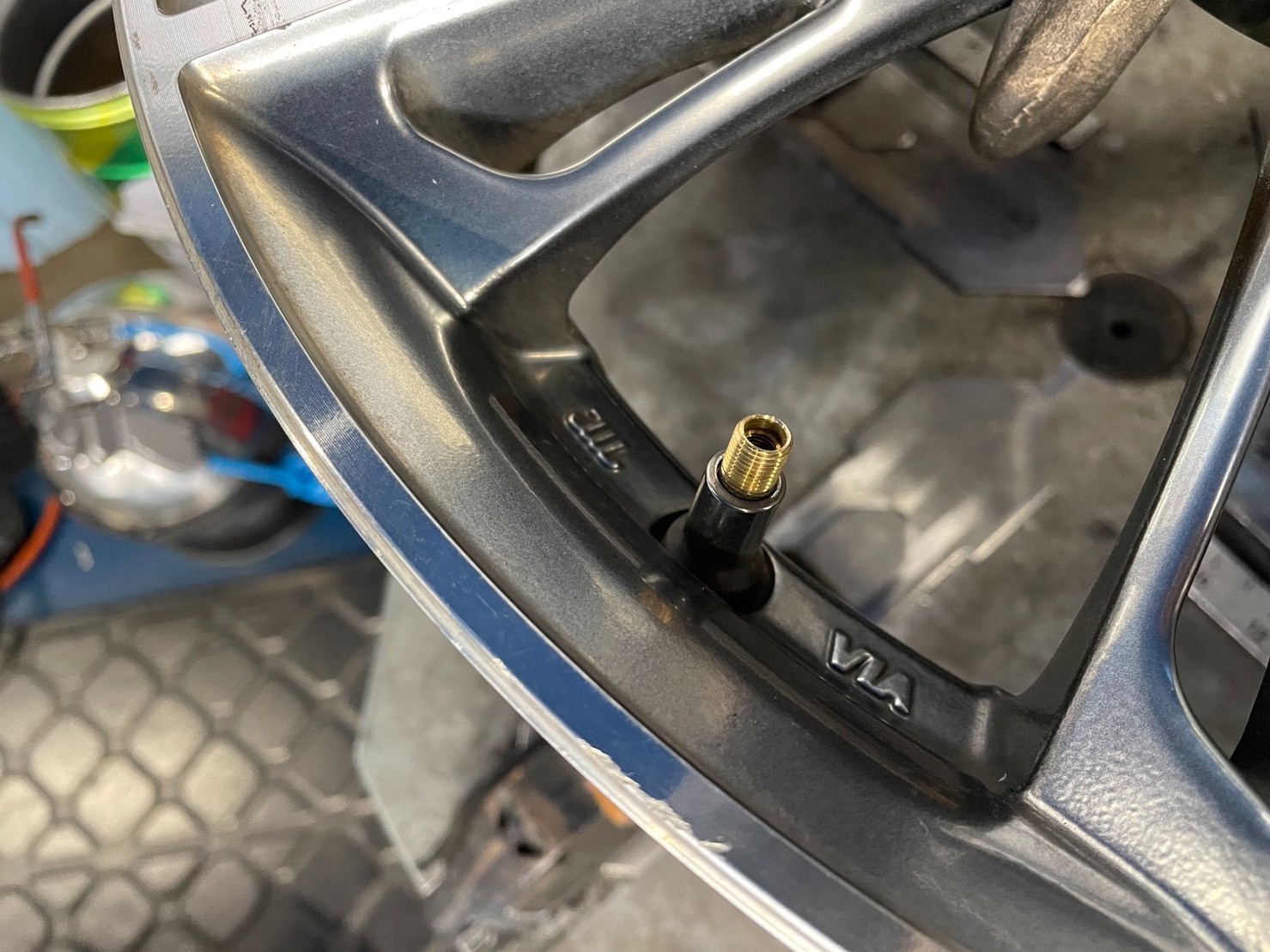 お次はこのくたびれたエアバルブを交換します。こちらもタイヤ交換したときにしか交換するタイミングがありません。ゴムなので長年使用しているとゴムが硬化しエア漏れの原因になります!またエアの蓋の役割のムシと呼ばれる部分も劣化してくるとエア漏れの原因になります!