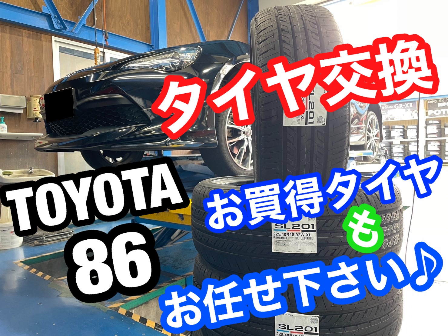 本日は当店でもかなりの台数にご来店いただいている人気車種『トヨタ 86』のタイヤを、タイヤ屋さんらしく交換していきます!!