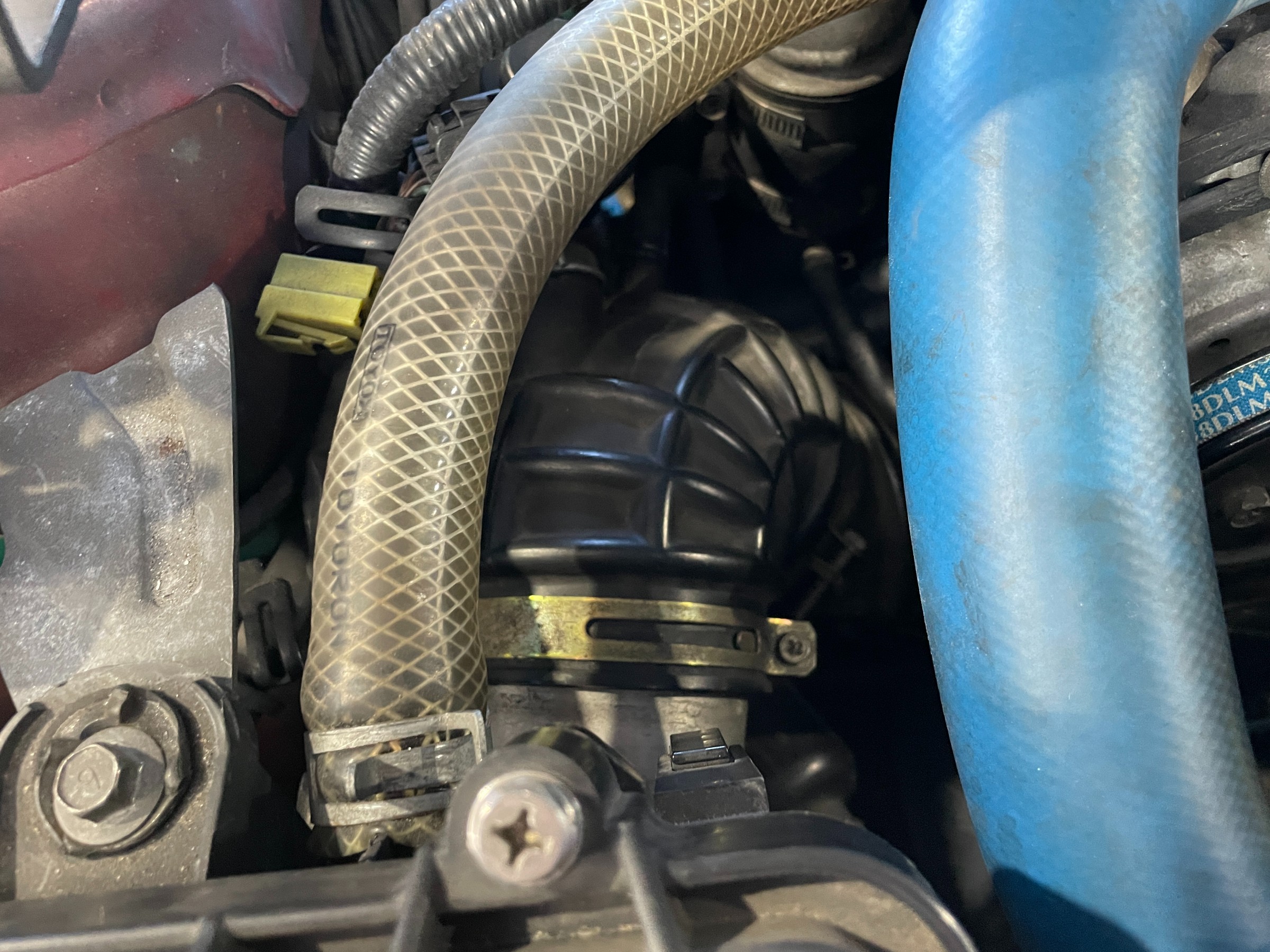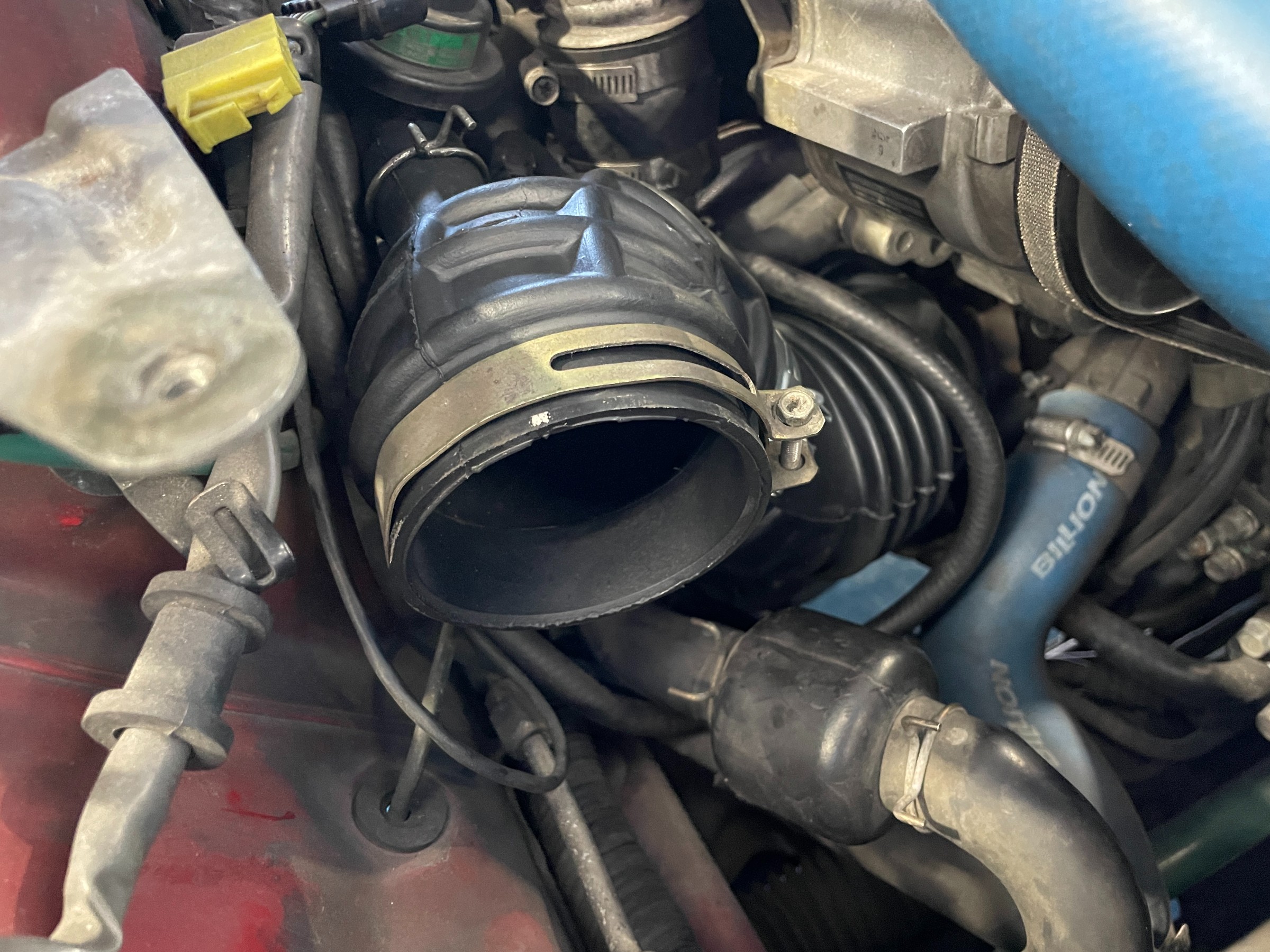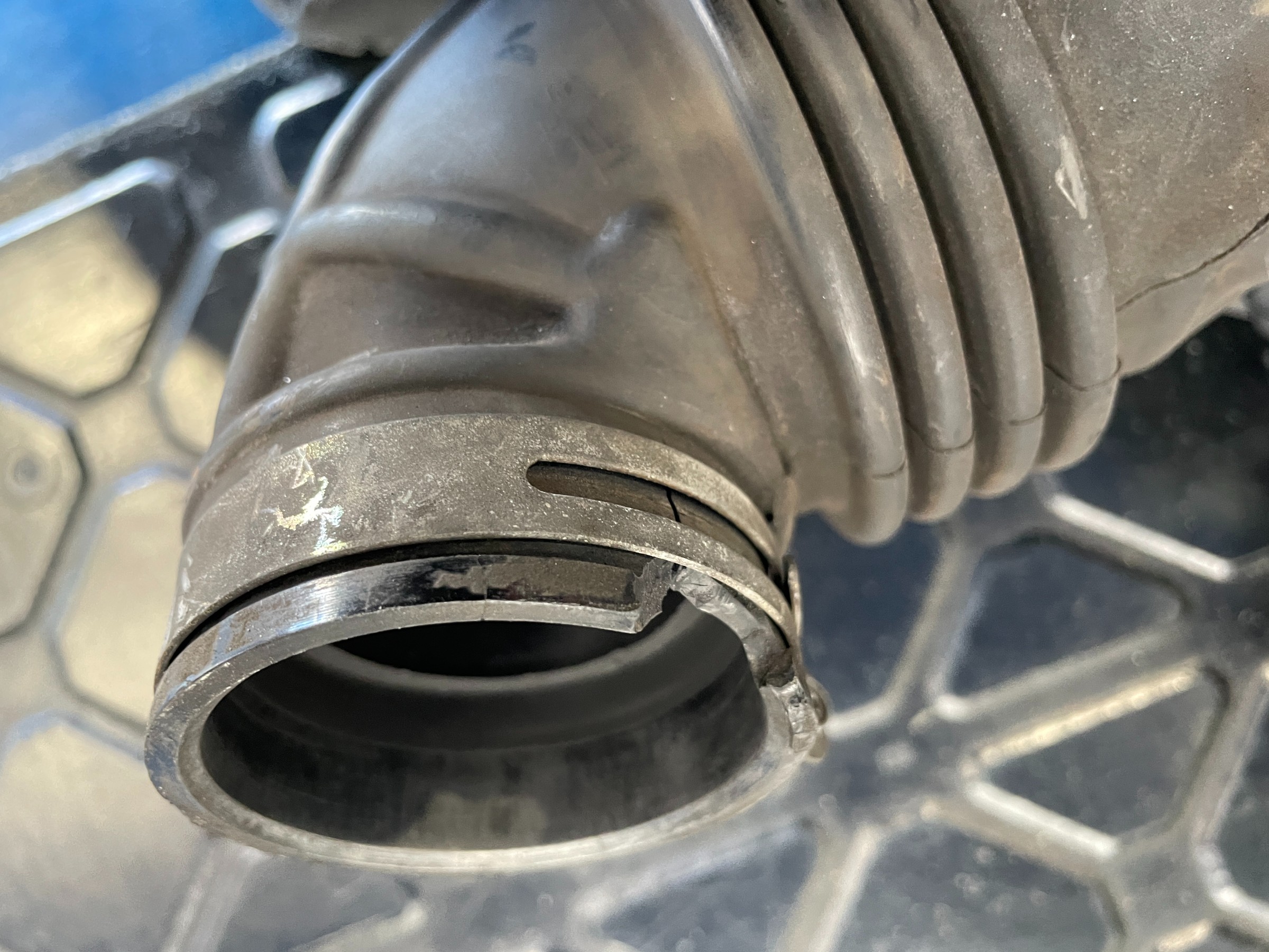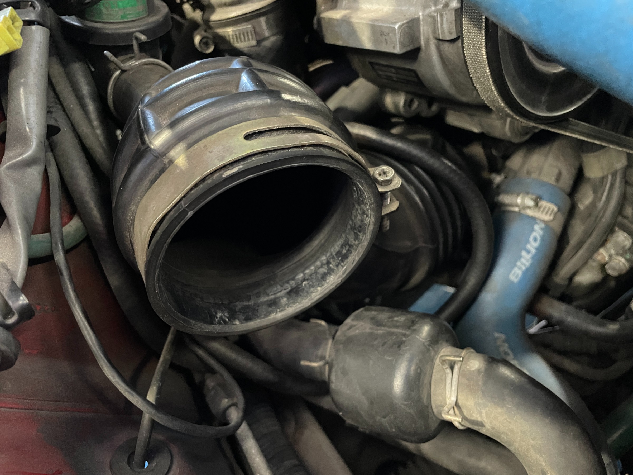 タービン側のゴムが終わってました!写真でもわかるくらい裂けています。バンドで締めこんでいっても、すぐに外れてしまいます。