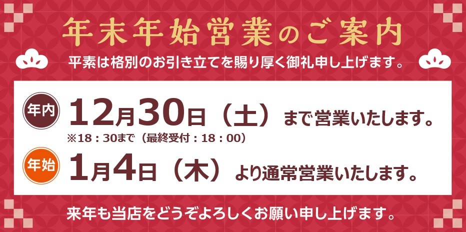 年内の営業日は12月30日(土曜日)までとなります。