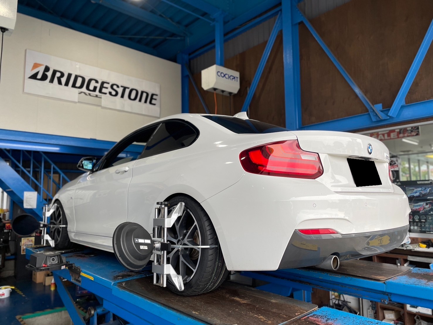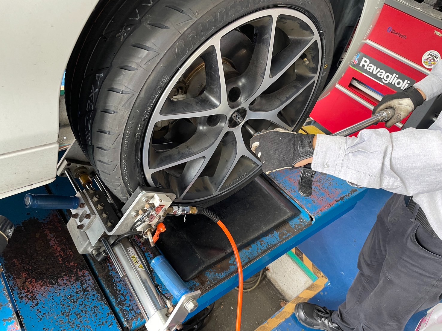 本日はせっかく新しいタイヤに交換したら長くキレイに使っていただきたいので、車の骨盤矯正といわれる『アライメント』まで一気に作業します!!