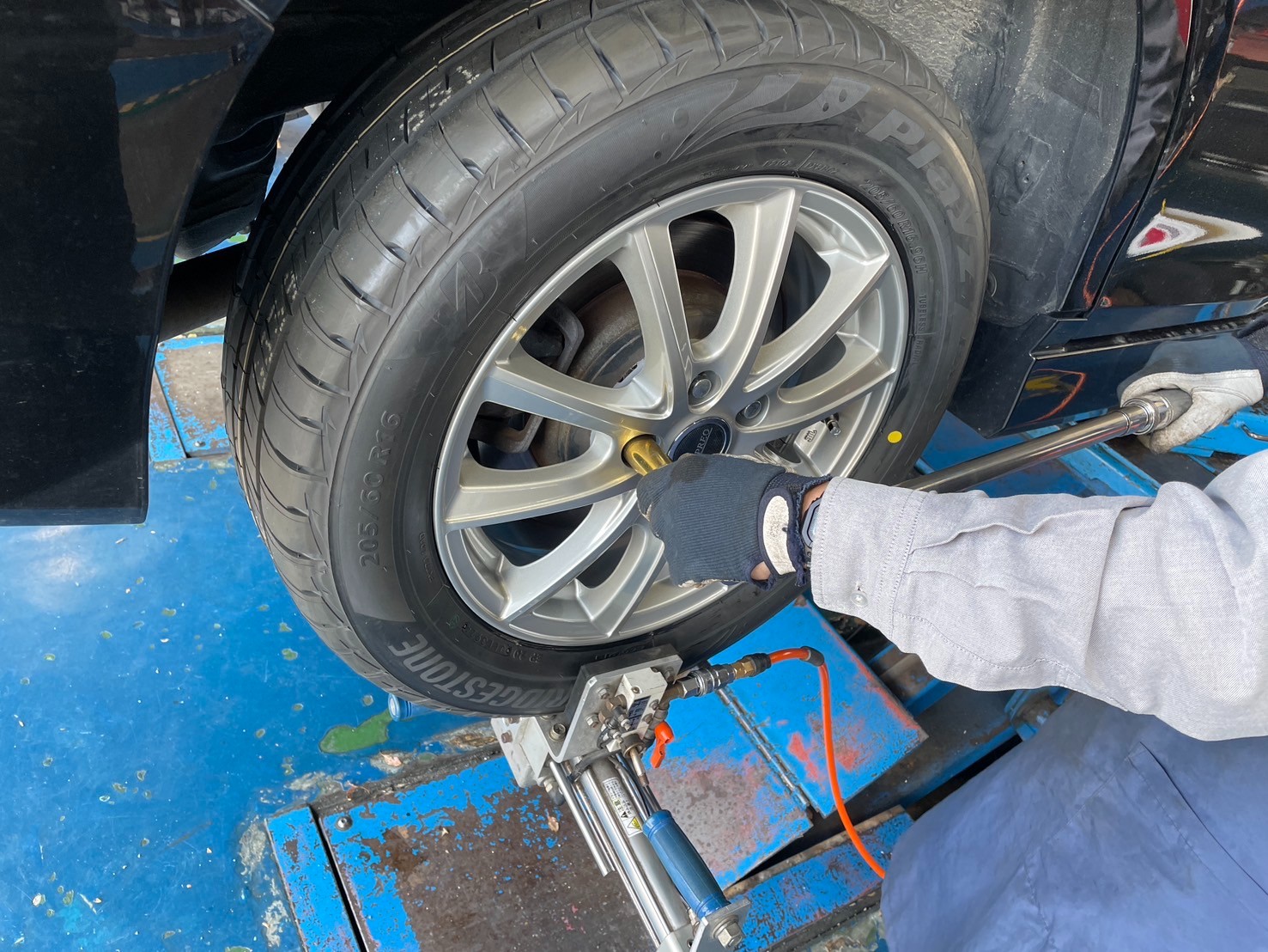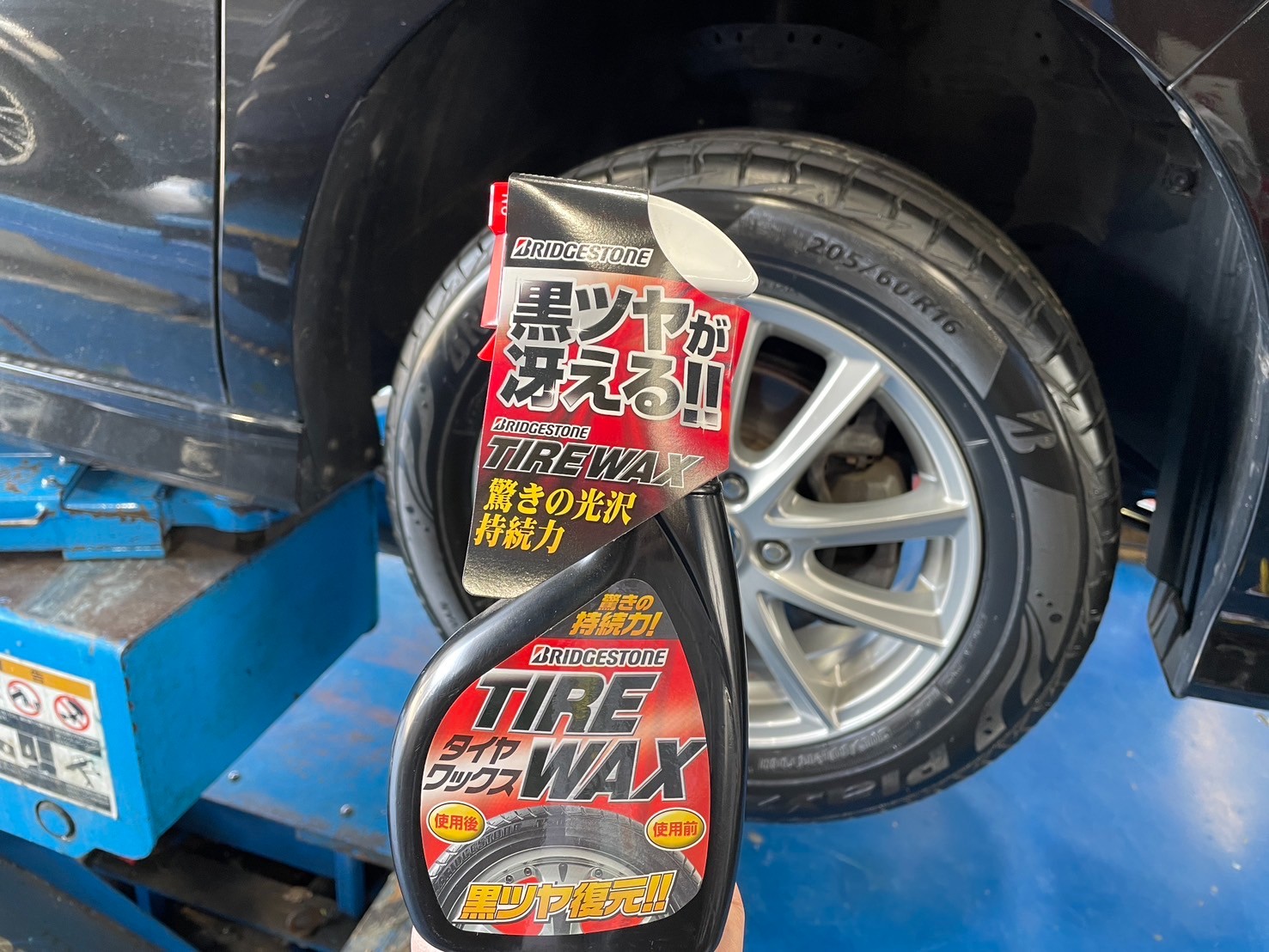 仕上げの『ブリヂストンタイヤワックス』を塗りこみタイヤ本来の黒ツヤを出して作業完了です!!