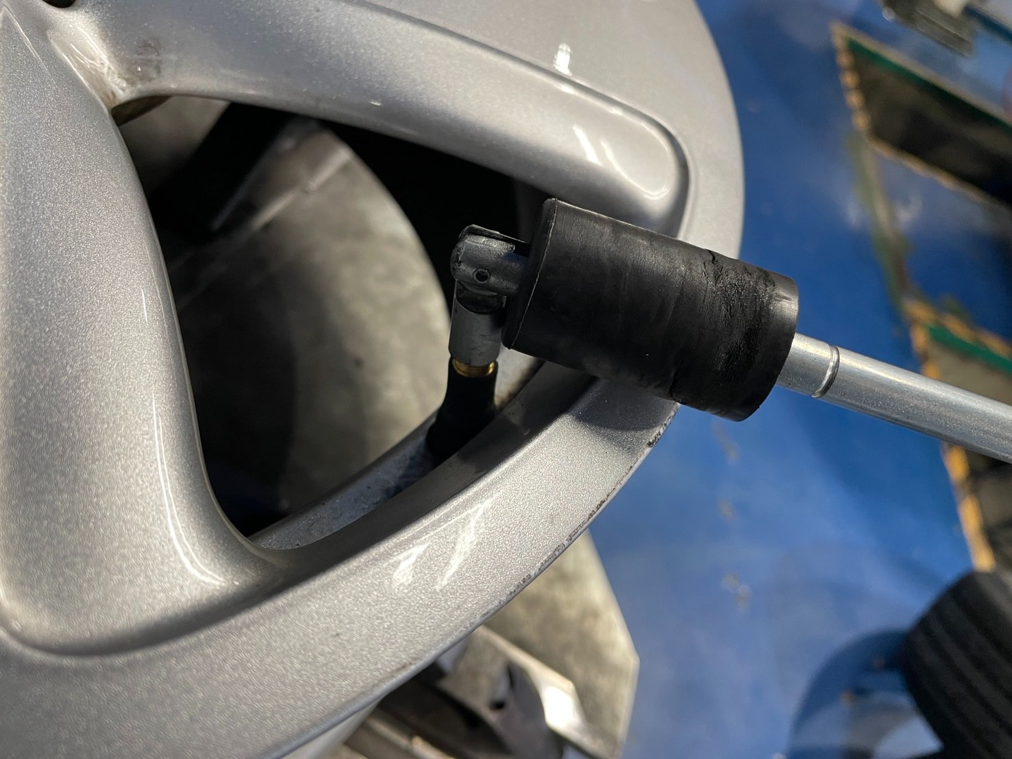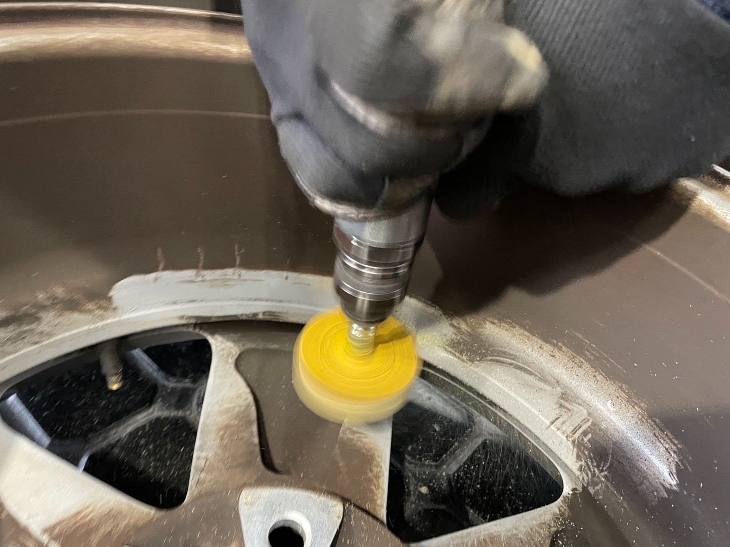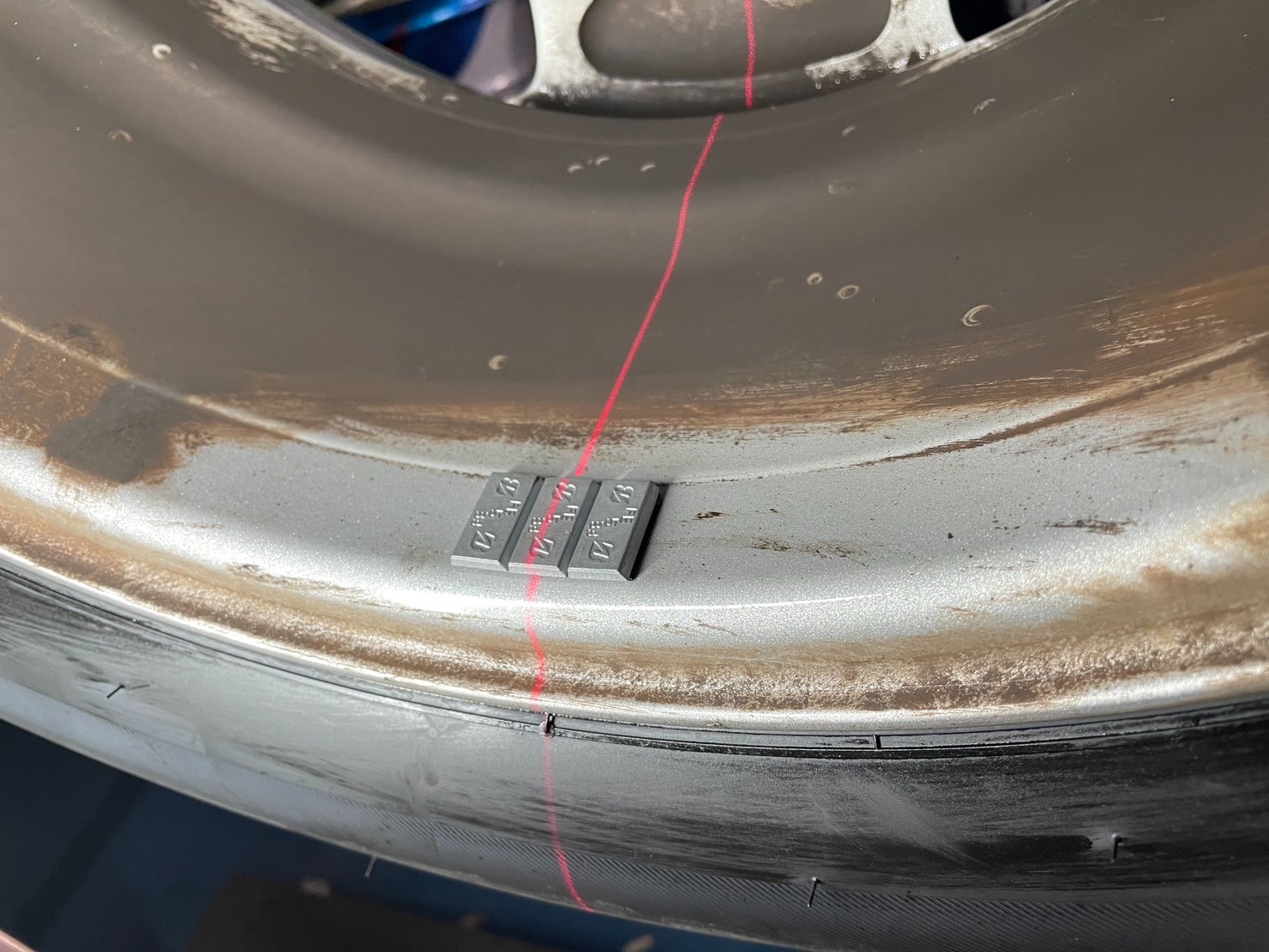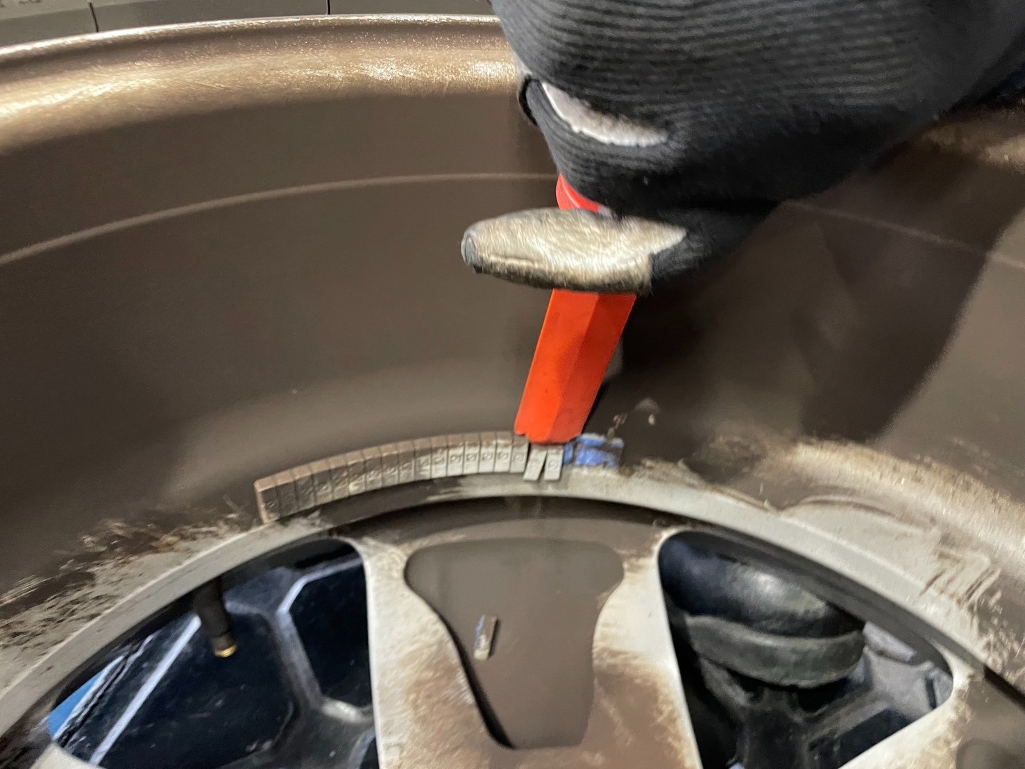 新しいバランスウェイトを貼り付け、もう一度タイヤを回すと、