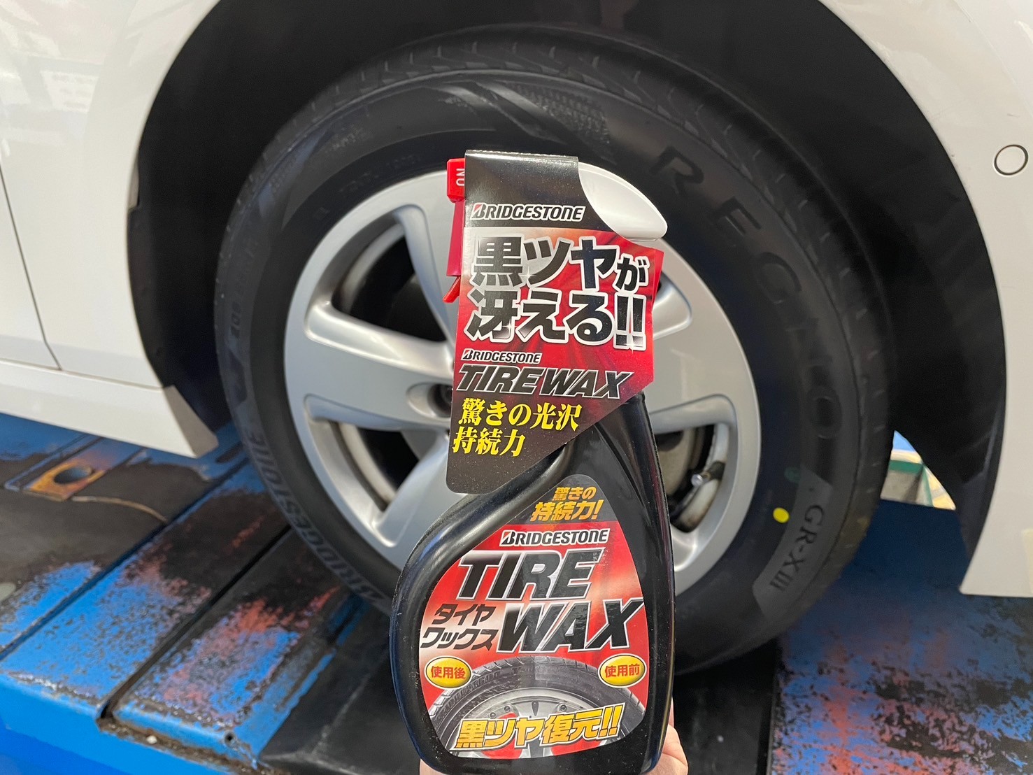 最後に当店おすすめの水溶性のブリヂストンタイヤワックスを塗りこみタイヤ交換作業は完了です!!