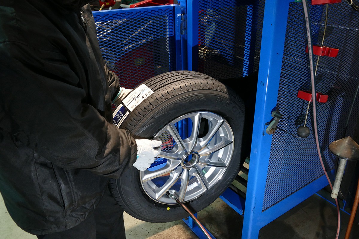 安全を確保するためケージの中で空気を充填します。タイヤ内圧の自然低下が少なくなり、より長く安定した状態に保つことができる窒素ガスの充填もおすすめしています。