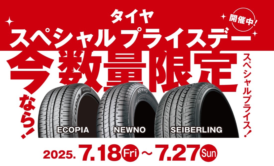 タイヤスペシャルプライスデーは、7/18(金)~7/27(日)まで。