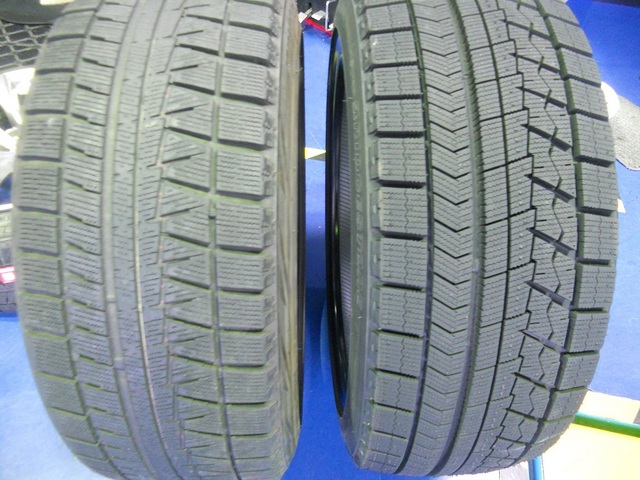 元々溝の深いスタッドレスタイヤはまだまだ使えそうな感じがありますが、新品と比べると一目瞭然ですね。