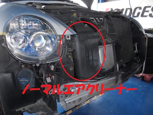 純正エアクリーナーBOXを取り外したら、ステンメッシュフィルター付きのエアクリを装着。