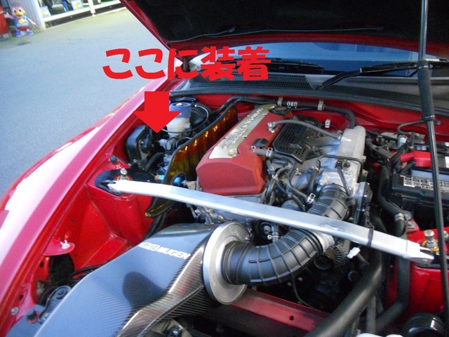 早速車両に装着すると、エンジンルームのちょっとワンポイントで華やかな感じになりました。
