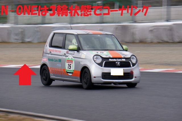 FFのN-ONEはリアタイヤを浮かした状態で、コーナリングしています。