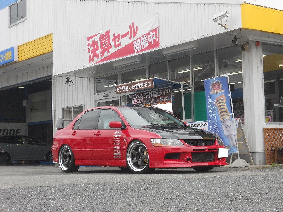 真っ赤なボディに、マットカーボンカラーのマイスターS1がとっても似合うランエボでした。