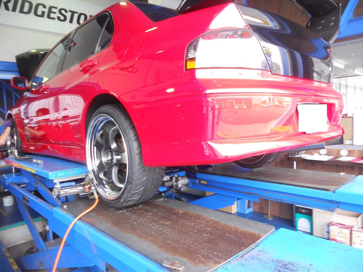 本日の作業紹介は、近頃ZOOMで人気沸騰中ランエボのタイヤ交換です。